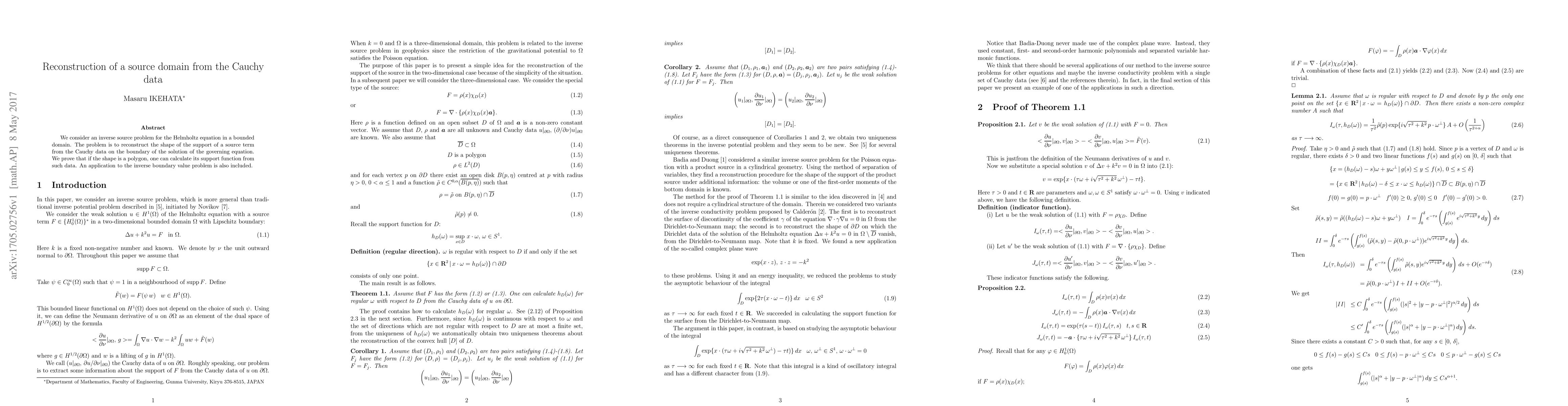 Researchers developed a method to reconstruct the shape of a source domain from Cauchy data on the boundary of a solution to the Helmholtz equation, with an application in inverse boundary value problems.