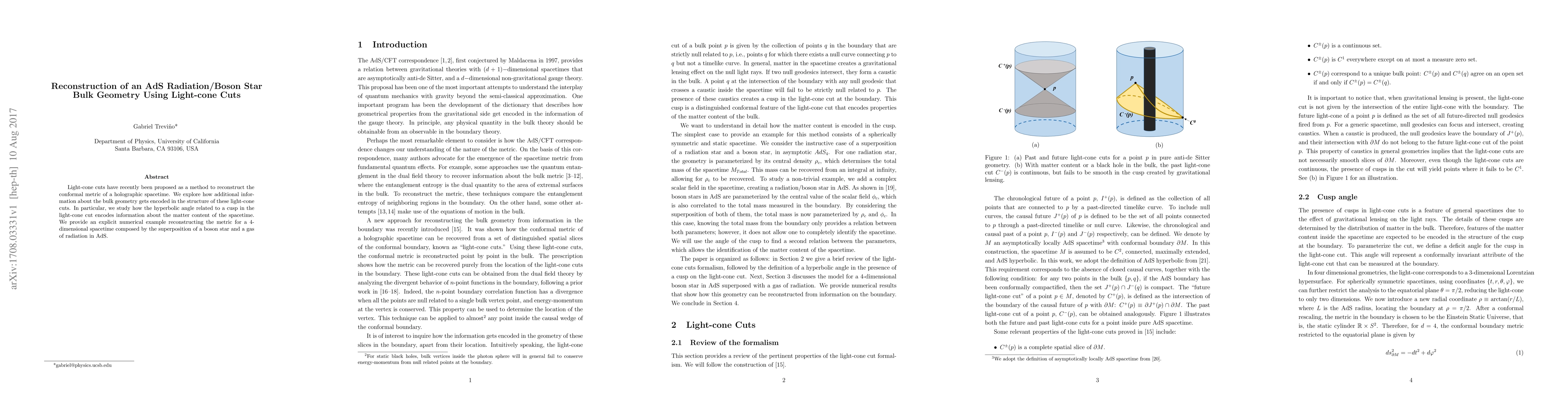 This paper explores the use of light-cone cuts to reconstruct the conformal metric of a holographic spacetime, demonstrating how the hyperbolic angle of cusps encodes bulk geometry information. It provides a numerical example reconstructing a 4-dimensional AdS spacetime composed of a boson star and radiation.