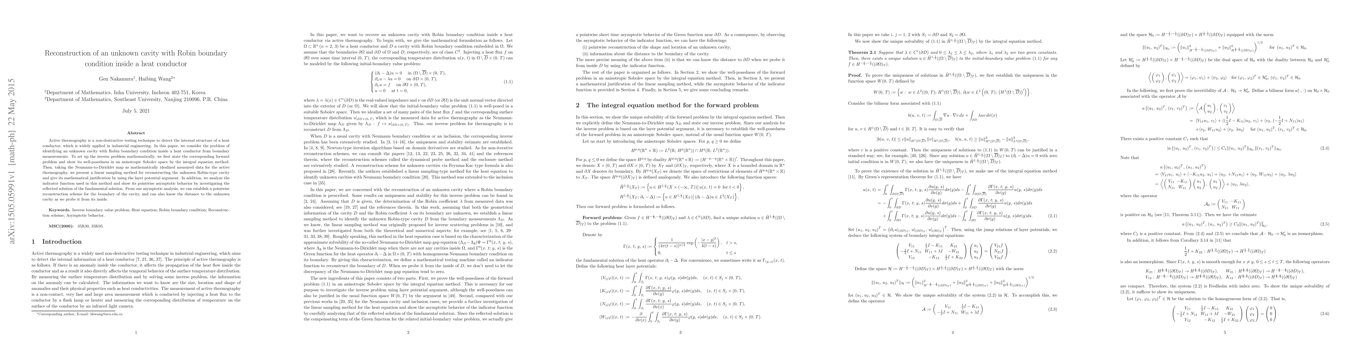 This paper proposes a method to identify an unknown cavity with Robin boundary conditions inside a heat conductor using active thermography. It establishes a mathematical framework for the inverse problem and utilizes a linear sampling method with layer potential arguments for reconstruction, providing an asymptotic analysis for the indicator function to achieve precise boundary and distance determination.
