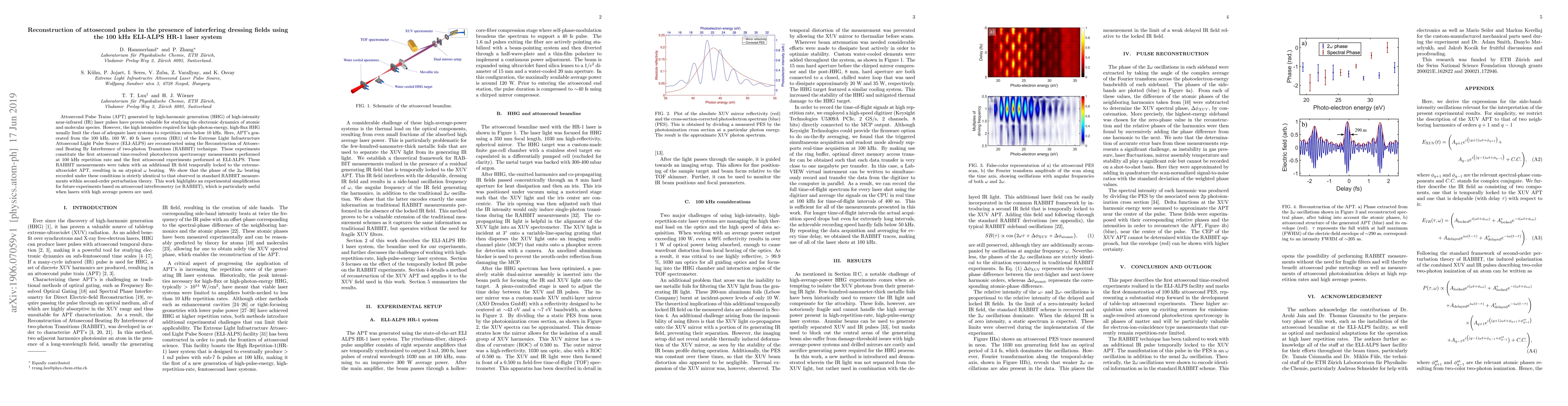 This paper reconstructs attosecond pulse trains generated by high-harmonic generation using the 100 kHz ELI-ALPS HR-1 laser system, employing the RABBIT technique. It demonstrates the first attosecond time-resolved photoelectron spectroscopy at 100 kHz and confirms the phase consistency of 2-omega beating in the presence of interfering dressing fields.