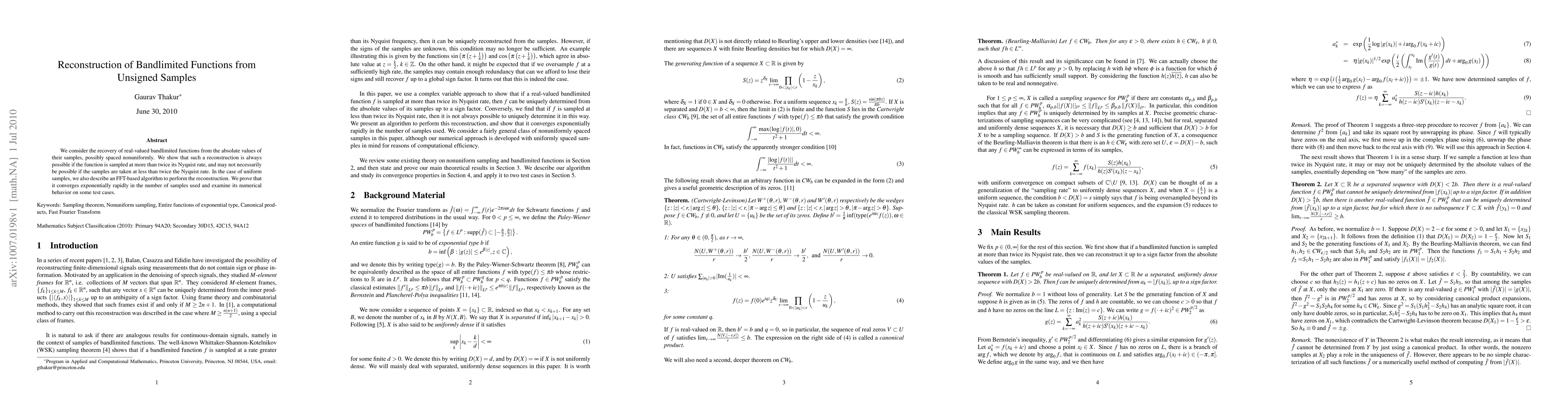 This research demonstrates that real-valued bandlimited functions can be reconstructed from the absolute values of their samples, provided sampling is above twice the Nyquist rate. An FFT-based algorithm for uniform samples is presented, proven to converge exponentially, with test case numerical behavior analyzed.