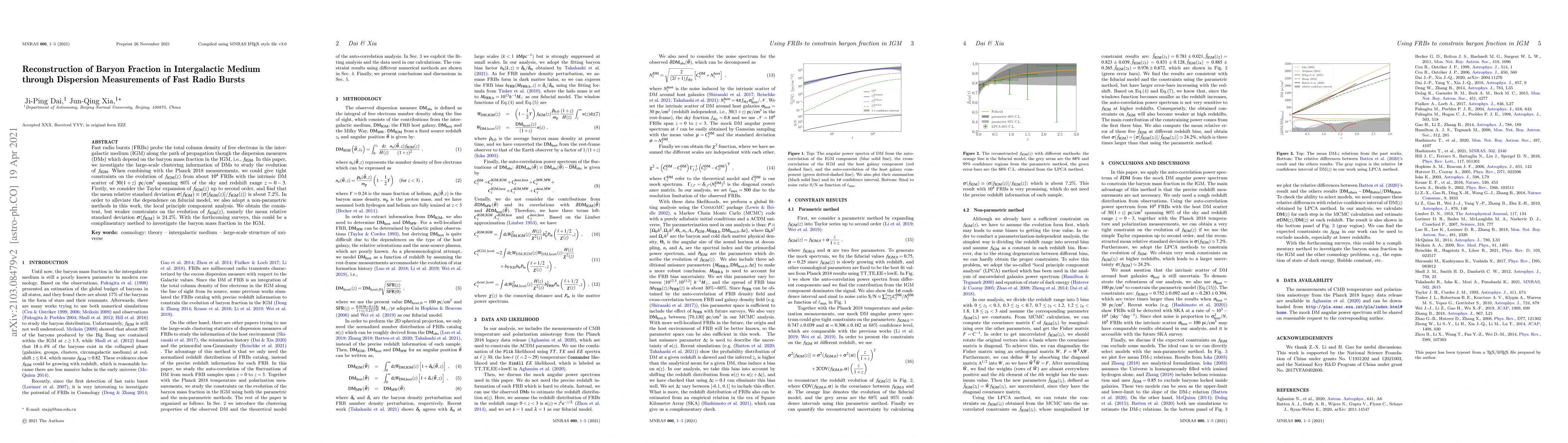 This paper investigates the baryon fraction in the intergalactic medium (IGM) using dispersion measures from fast radio bursts (FRBs) and combines this with Planck 2018 measurements to constrain the evolution of the baryon mass fraction. The study finds a mean relative standard deviation of 7.2% using a Taylor expansion model, and 24.2% using a non-parametric local principle component analysis method.