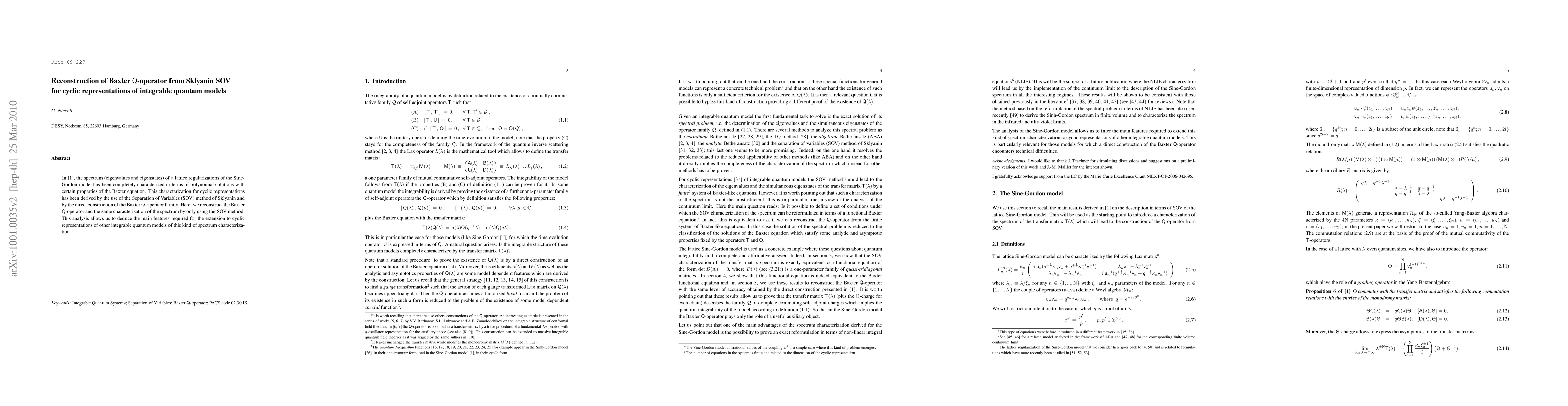 In [1], the spectrum (eigenvalues and eigenstates) of a lattice regularizations of the Sine-Gordon model has been completely characterized in terms of polynomial solutions with certain properties of the Baxter equation. This characterization for cyclic representations has been derived by the use of the Separation of Variables (SOV) method of Sklyanin and by the direct construction of the Baxter Q-operator family. Here, we reconstruct the Baxter Q-operator and the same characterization of the spectrum by only using the SOV method. This analysis allows us to deduce the main features required for the extension to cyclic representations of other integrable quantum models of this kind of spectrum characterization.
