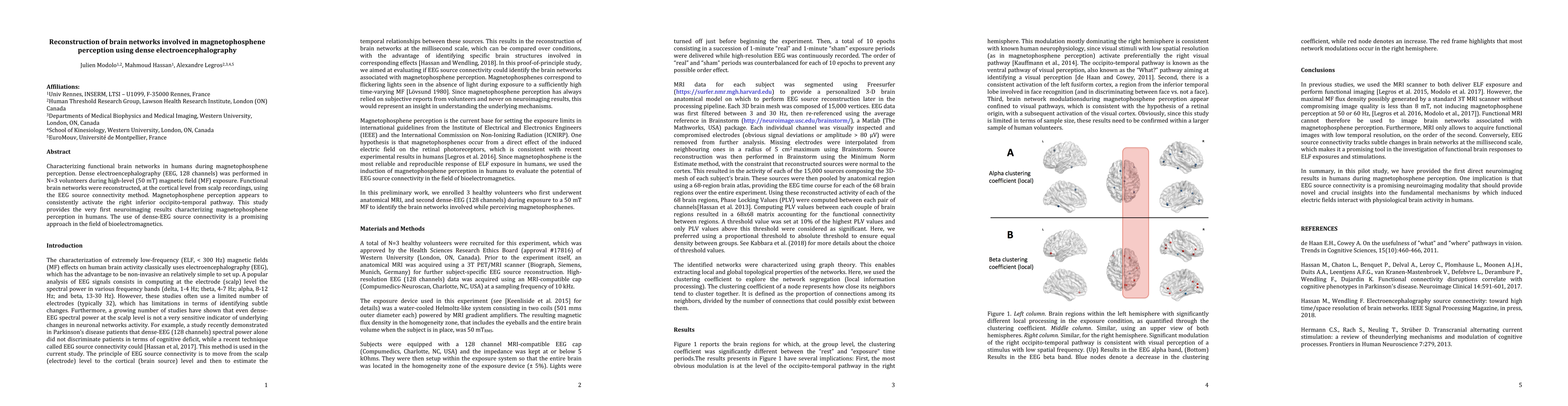 This study uses dense electroencephalography (128 channels) to reconstruct functional brain networks during magnetophosphene perception in humans, revealing consistent activation of the right inferior occipito-temporal pathway. The dense EEG source connectivity method offers a promising new approach for bioelectromagnetic research.