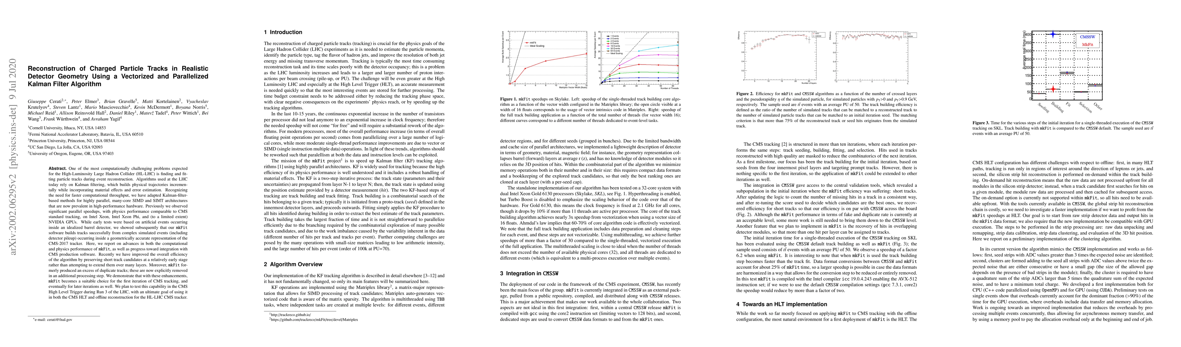 This paper presents a vectorized and parallelized Kalman filter algorithm for reconstructing charged particle tracks in realistic detector geometry, achieving significant computational speedups on modern high-performance hardware. The mkFit software, enhanced to remove duplicate tracks and improve efficiency, shows promising performance for the first iteration of CMS tracking and is planned for integration with CMS production software for the HL-LHC.