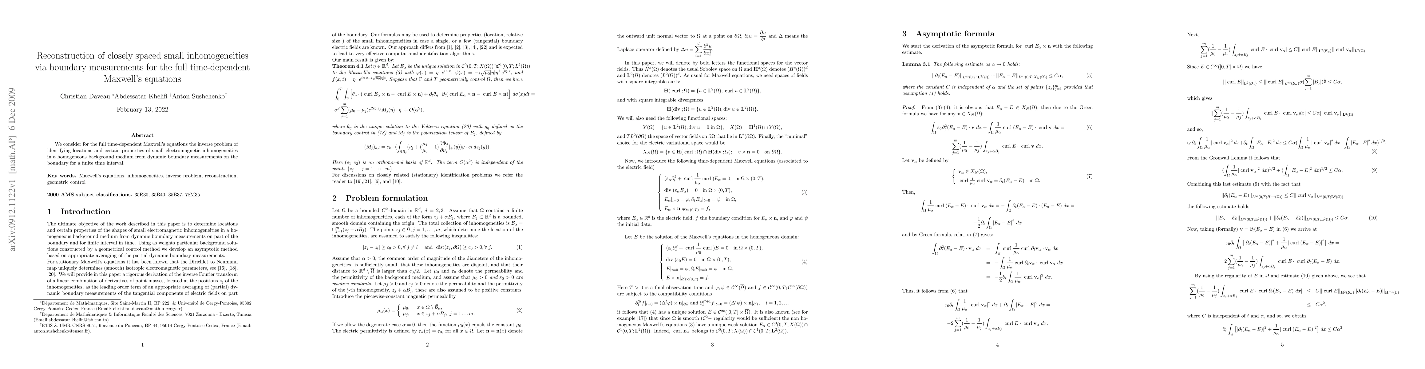 Summary: This paper addresses the inverse problem of reconstructing small electromagnetic inhomogeneities within a homogeneous medium using dynamic boundary measurements over a finite time interval, based on the full time-dependent Maxwell's equations. The method aims to identify both the locations and properties of these inhomogeneities.