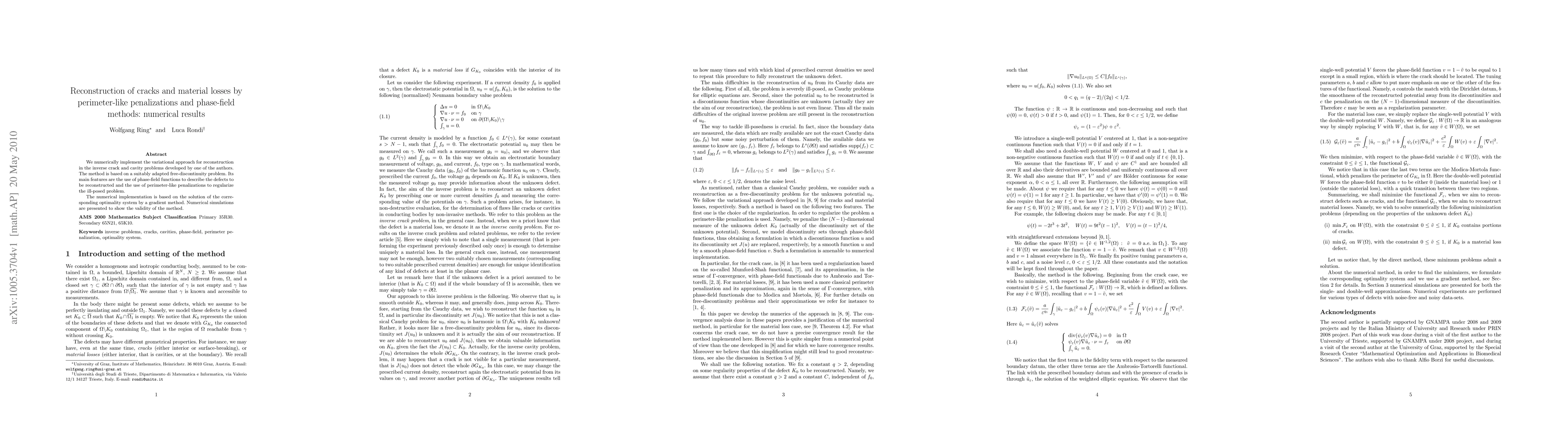 We numerically implement the variational approach for reconstruction in the inverse crack and cavity problems developed by one of the authors. The method is based on a suitably adapted free-discontinuity problem. Its main features are the use of phase-field functions to describe the defects to be reconstructed and the use of perimeter-like penalizations to regularize the ill-posed problem. The numerical implementation is based on the solution of the corresponding optimality system by a gradient method. Numerical simulations are presented to show the validity of the method.