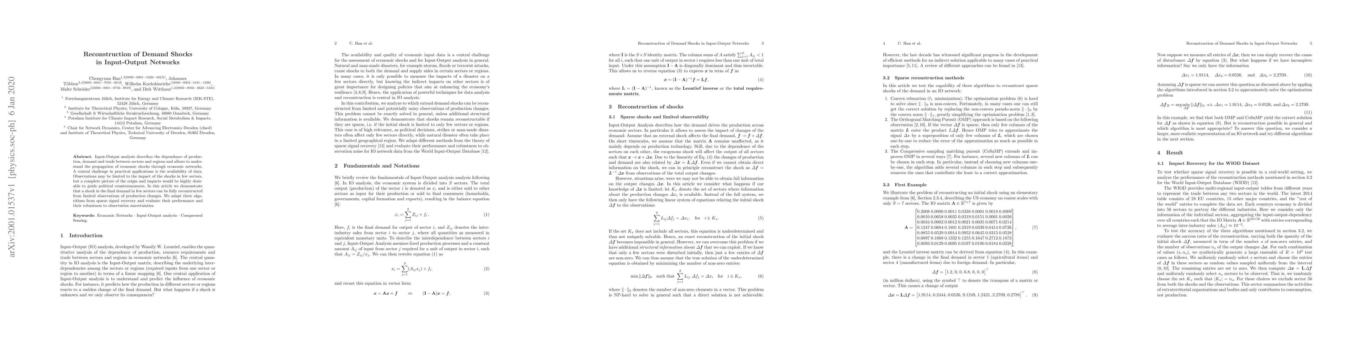 Input-Output analysis describes the dependence of production, demand and trade between sectors and regions and allows to understand the propagation of economic shocks through economic networks. A central challenge in practical applications is the availability of data. Observations may be limited to the impact of the shocks in few sectors, but a complete picture of the origin and impacts would be highly desirable to guide political countermeasures. In this article we demonstrate that a shock in the final demand in few sectors can be fully reconstructed from limited observations of production changes. We adapt three algorithms from sparse signal recovery and evaluate their performance and their robustness to observation uncertainties.