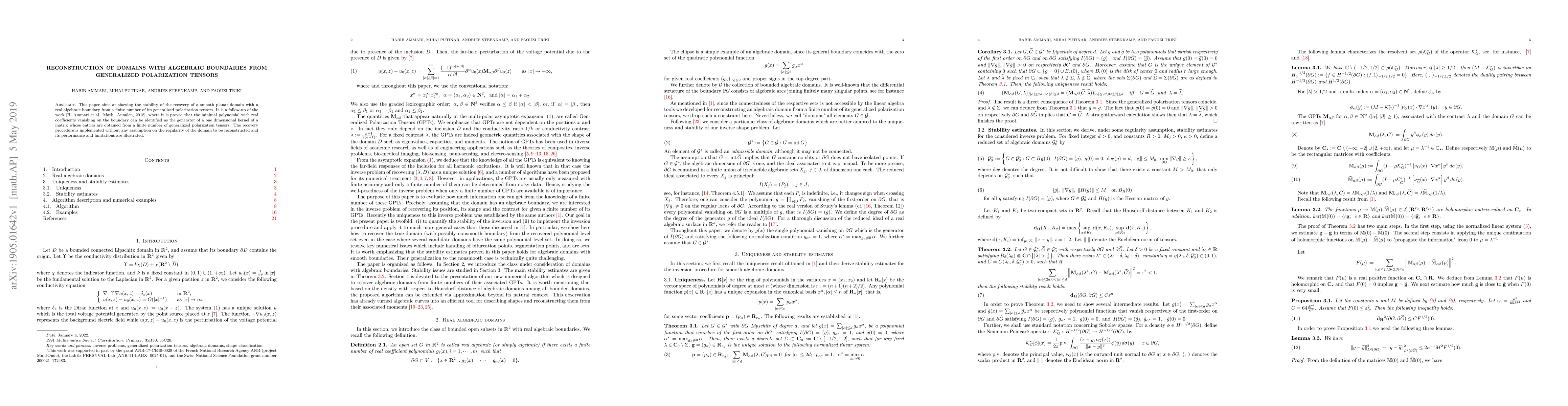 This paper aims at showing the stability of the recovery of a smooth planar domain with a real algebraic boundary from a finite number of its generalized polarization tensors. It is a follow-up of the work [H. Ammari et al., Math. Annalen, 2018], where it is proved that the minimal polynomial with real coefficients vanishing on the boundary can be identified as the generator of a one dimensional kernel of a matrix whose entries are obtained from a finite number of generalized polarization tensors. The recovery procedure is implemented without any assumption on the regularity of the domain to be reconstructed and its performance and limitations are illustrated.