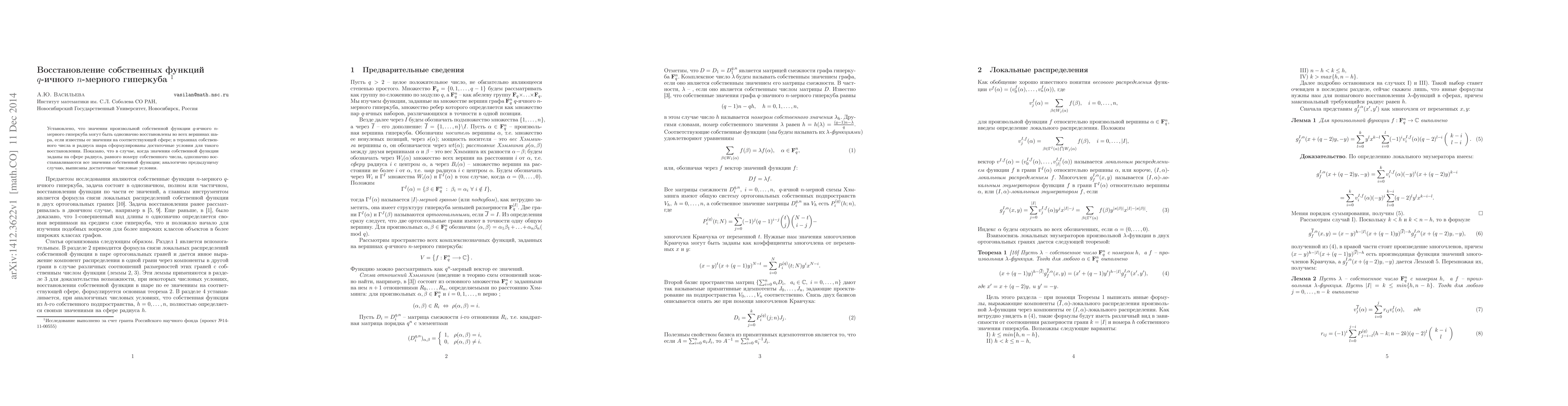 This paper develops methods to reconstruct eigenfunctions of $q$-ary $n$-dimensional hypercubes when given all values on a sphere. It shows that all values within the corresponding ball can be uniquely determined under supplementary conditions, and that full eigenfunction values can be uniquely determined when the radius equals the eigenvalue number.