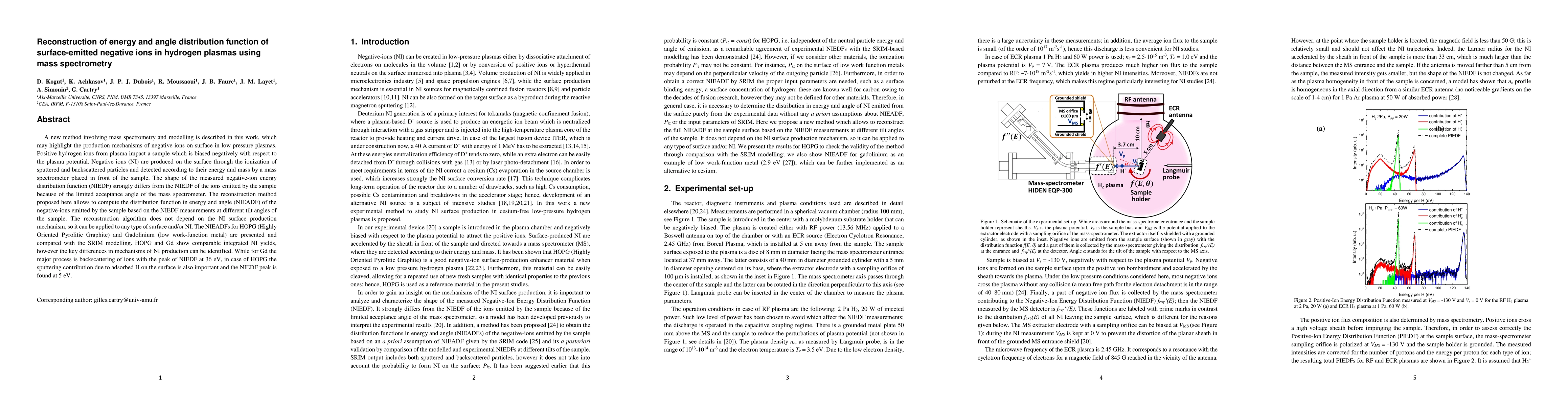 This paper introduces a method using mass spectrometry and modelling to reconstruct the energy and angle distribution function of surface-emitted negative ions in hydrogen plasmas. The method reveals distinct production mechanisms for negative ions on different surfaces, highlighting the role of sputtering and backscattering processes.