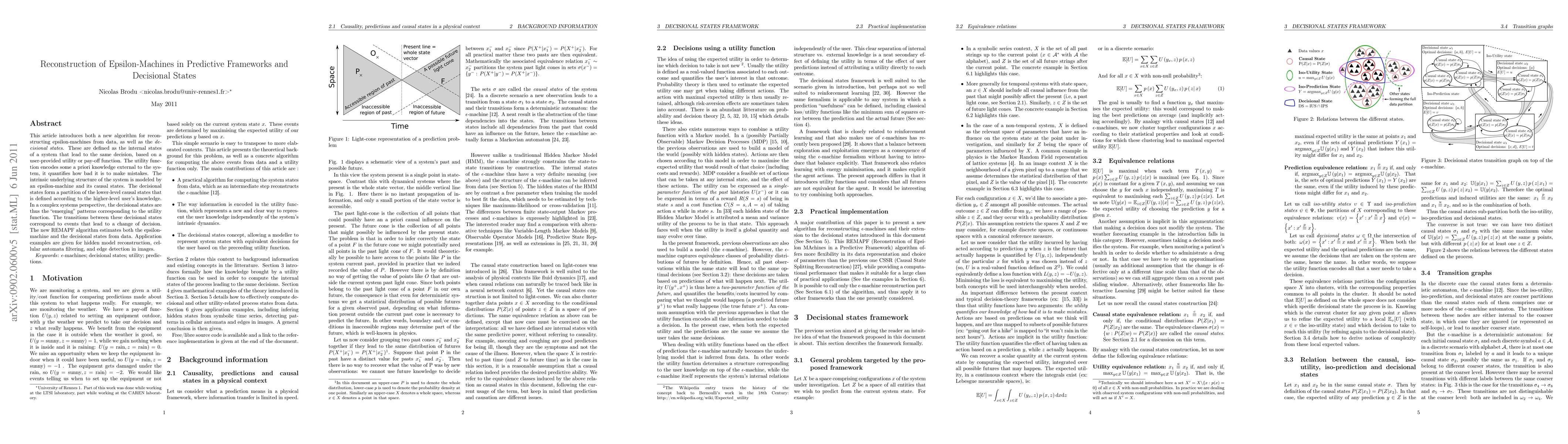 This article introduces both a new algorithm for reconstructing epsilon-machines from data, as well as the decisional states. These are defined as the internal states of a system that lead to the same decision, based on a user-provided utility or pay-off function. The utility function encodes some a priori knowledge external to the system, it quantifies how bad it is to make mistakes. The intrinsic underlying structure of the system is modeled by an epsilon-machine and its causal states. The decisional states form a partition of the lower-level causal states that is defined according to the higher-level user's knowledge. In a complex systems perspective, the decisional states are thus the "emerging" patterns corresponding to the utility function. The transitions between these decisional states correspond to events that lead to a change of decision. The new REMAPF algorithm estimates both the epsilon-machine and the decisional states from data. Application examples are given for hidden model reconstruction, cellular automata filtering, and edge detection in images.