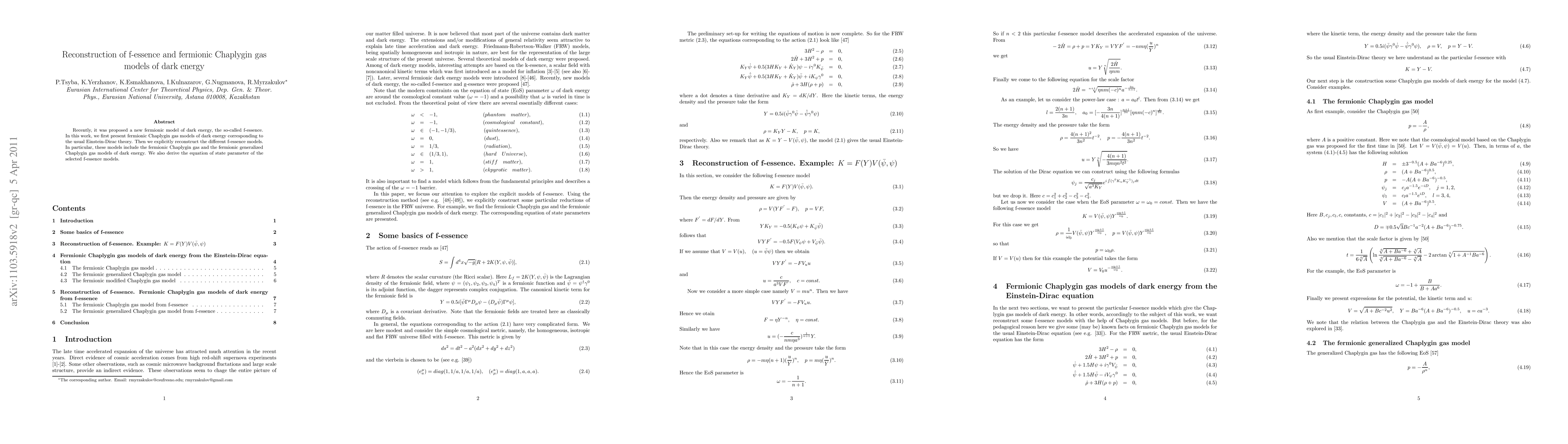 This paper reconstructs various f-essence models, including fermionic Chaplygin gas and generalized Chaplygin gas models, and derives their corresponding equation of state parameters for dark energy.