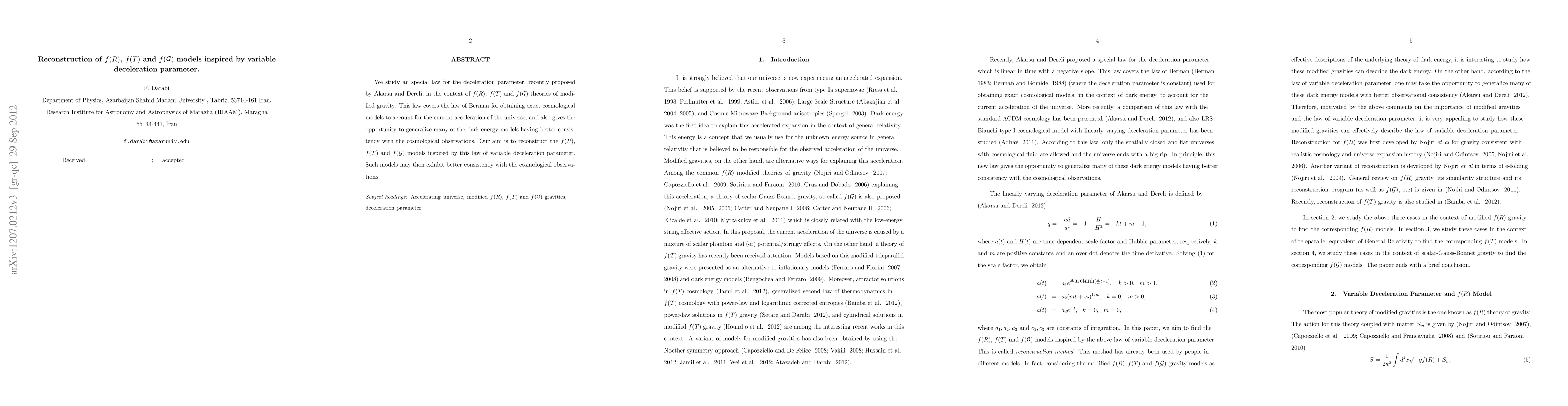 We study an special law for the deceleration parameter, recently proposed by Akarsu and Dereli, in the context of $f(R)$, $f(T)$ and $f(\mathcal{G})$ theories of modified gravity. This law covers the law of Berman for obtaining exact cosmological models to account for the current acceleration of the universe, and also gives the opportunity to generalize many of the dark energy models having better consistency with the cosmological observations. Our aim is to reconstruct the $f(R)$, $f(T)$ and $f(\mathcal{G})$ models inspired by this law of variable deceleration parameter. Such models may then exhibit better consistency with the cosmological observations.