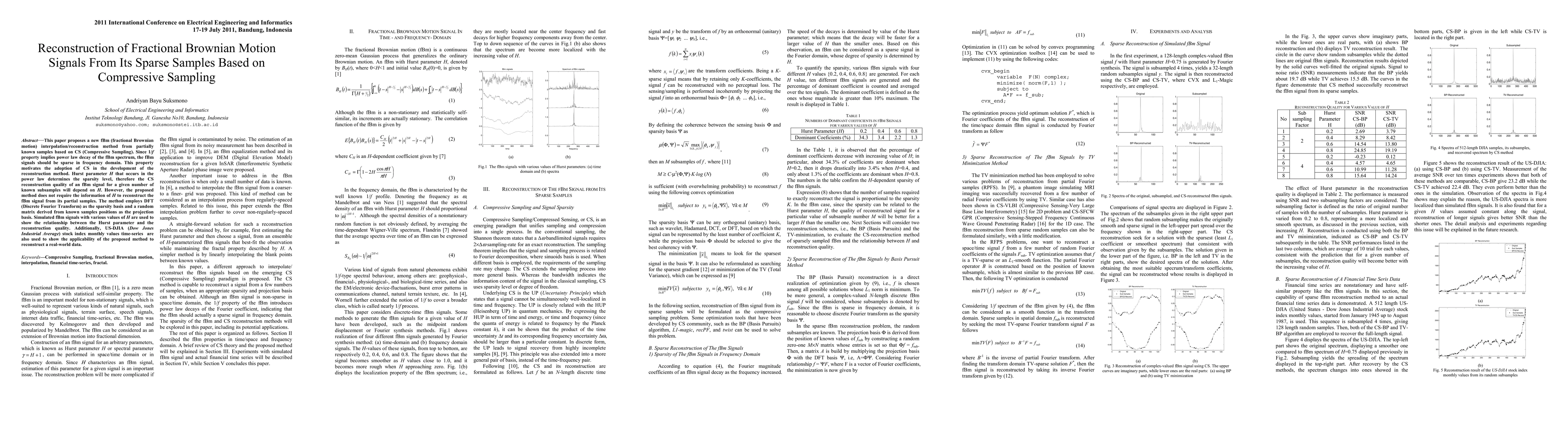 This paper introduces a novel method for reconstructing fractional Brownian motion (fBm) signals from sparse samples using Compressive Sampling, leveraging the power law decay of the fBm spectrum. The proposed method does not require knowledge of the Hurst parameter H, employing DFT and a random matrix for reconstruction, and demonstrates effectiveness on both simulated fBm signals and real-world Dow Jones Industrial Average data.
