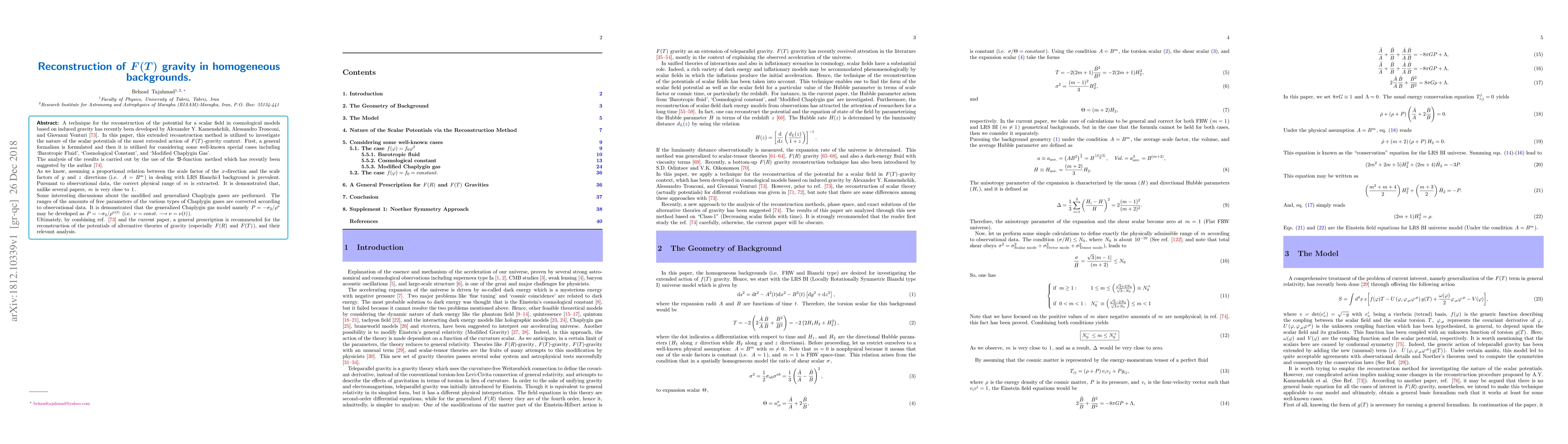 This paper extends a scalar field reconstruction technique for $F(T)$-gravity models, analyzing special cases like Barotropic Fluid, Cosmological Constant, and Modified Chaplygin Gas using the $mathfrak{B} ext{-function}$ method. It concludes that observational data suggests $m approx 1$ in LRS Bianchi-I background, corrects Chaplygin gas parameter ranges, and proposes a general prescription for reconstructing potentials in alternative gravity theories like $F(R)$ and $F(T)$.