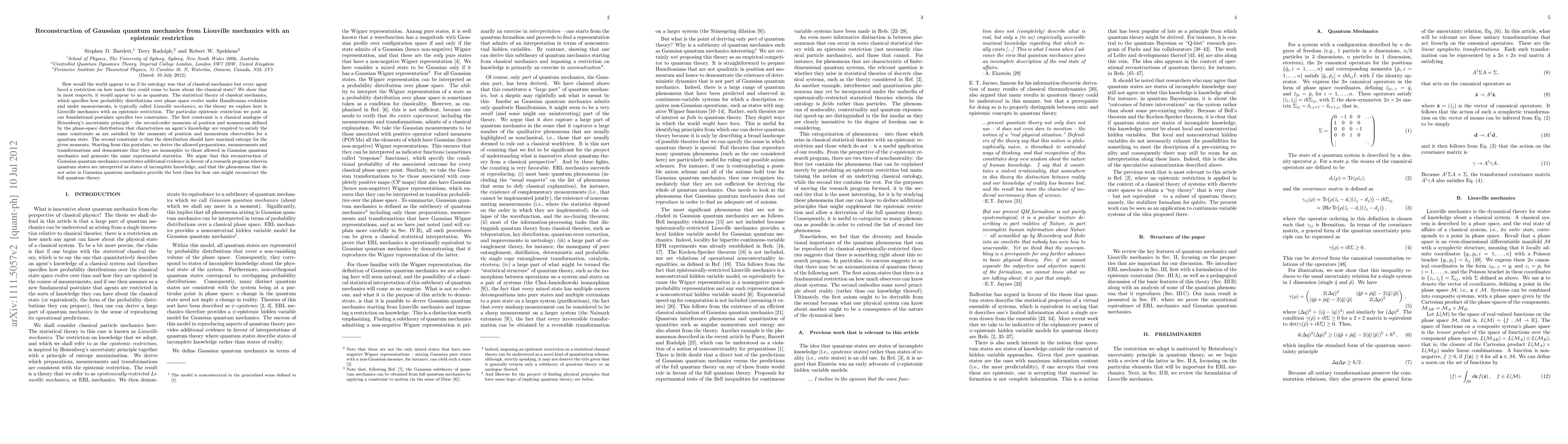 This paper reconstructs Gaussian quantum mechanics from Liouville mechanics with an epistemic restriction, positing that classical mechanics with knowledge constraints mimics quantum behavior. The epistemic restriction includes a classical analogue of Heisenberg's uncertainty principle and maximal entropy for given moments, leading to quantum-like preparations, measurements, and transformations.