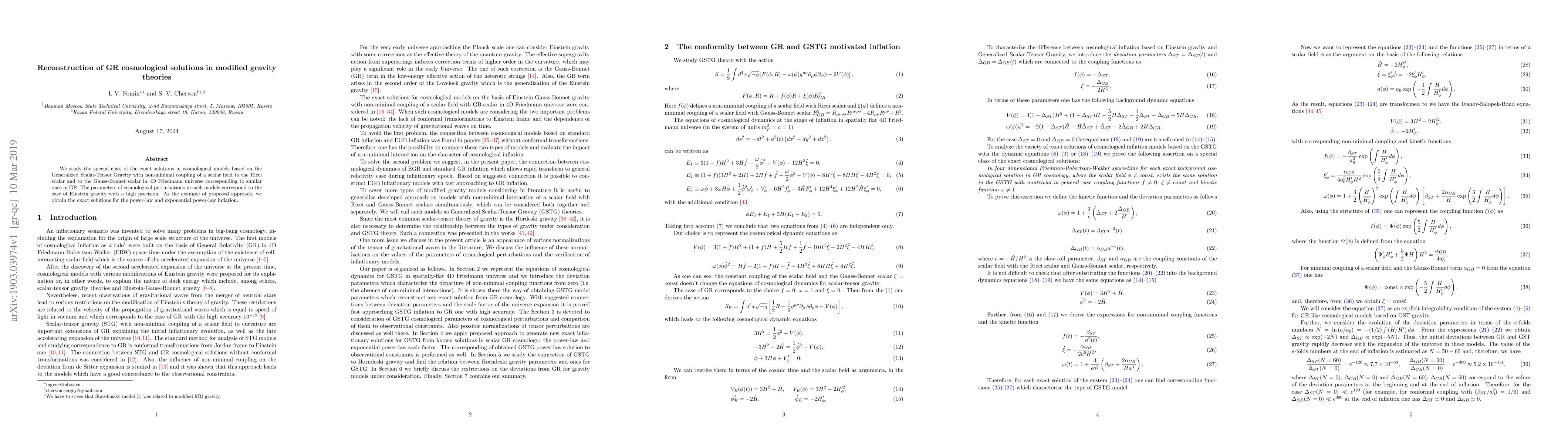 We study the special class of the exact solutions in cosmological models based on the Generalized Scalar-Tensor Gravity with non-minimal coupling of a scalar field to the Ricci scalar and to the Gauss-Bonnet scalar in 4D Friedmann universe corresponding to similar ones in GR. The parameters of cosmological perturbations in such models correspond to the case of Einstein gravity with a high precision. As the example of proposed approach, we obtain the exact solutions for the power-law and exponential power-law inflation.