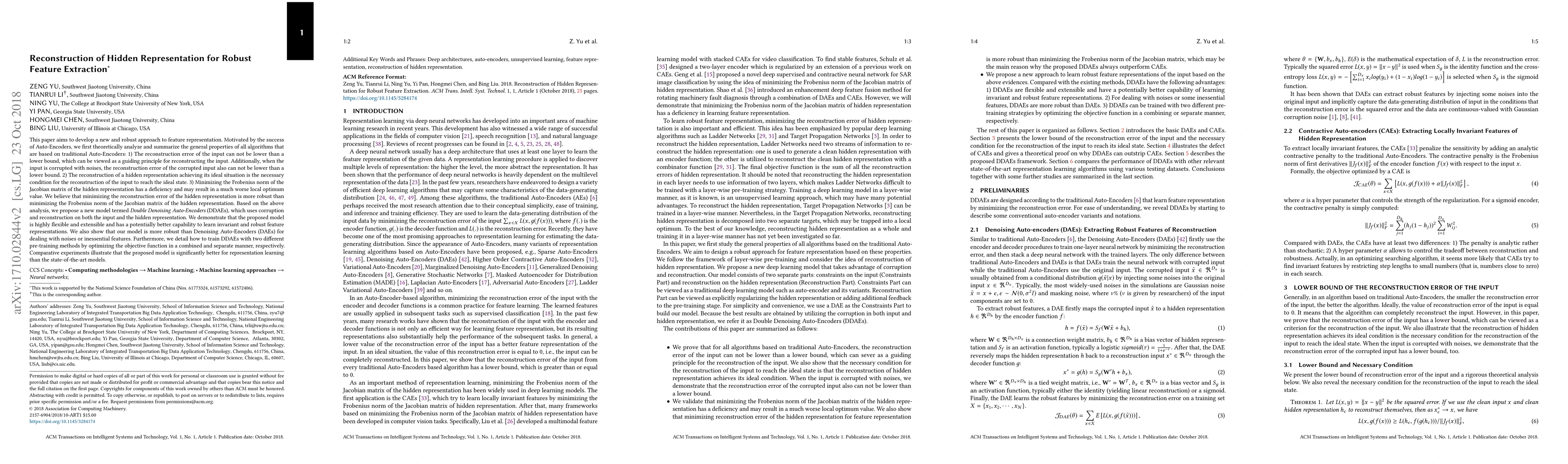 This paper proposes a new model called Double Denoising Auto-Encoders (DDAEs) that learns robust feature representations by using corruption and reconstruction on both the input and hidden representation. The proposed model outperforms state-of-the-art models for representation learning, especially in handling noises or irrelevant features.