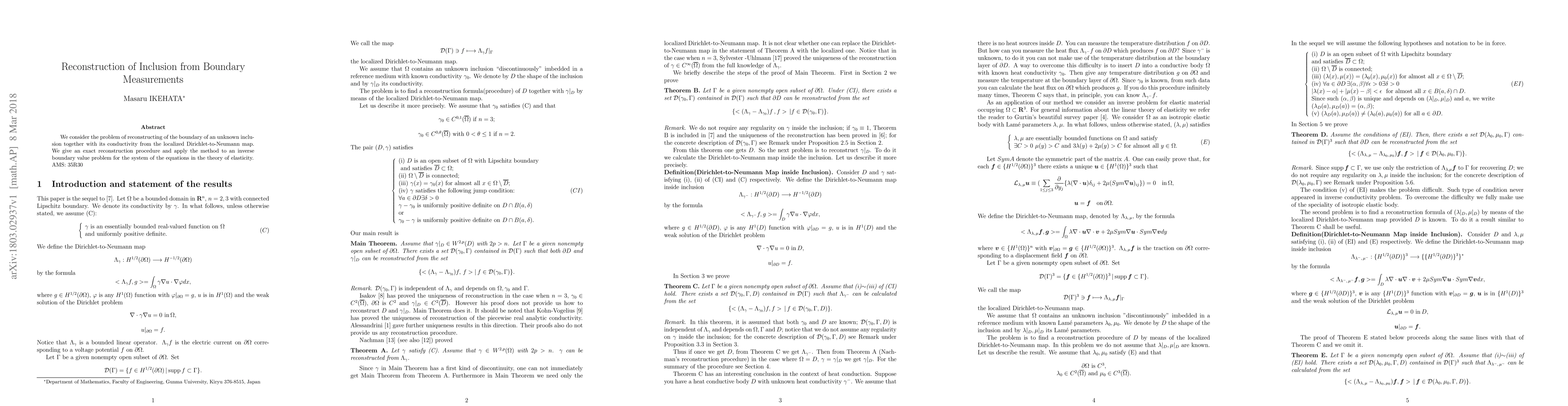 We consider the problem of reconstructing of the boundary of an unknown inclusion together with its conductivity from the localized Dirichlet-to-Neumann map. We give an exact reconstruction procedure and apply the method to an inverse boundary value problem for the system of the equations in the theory of elasticity.