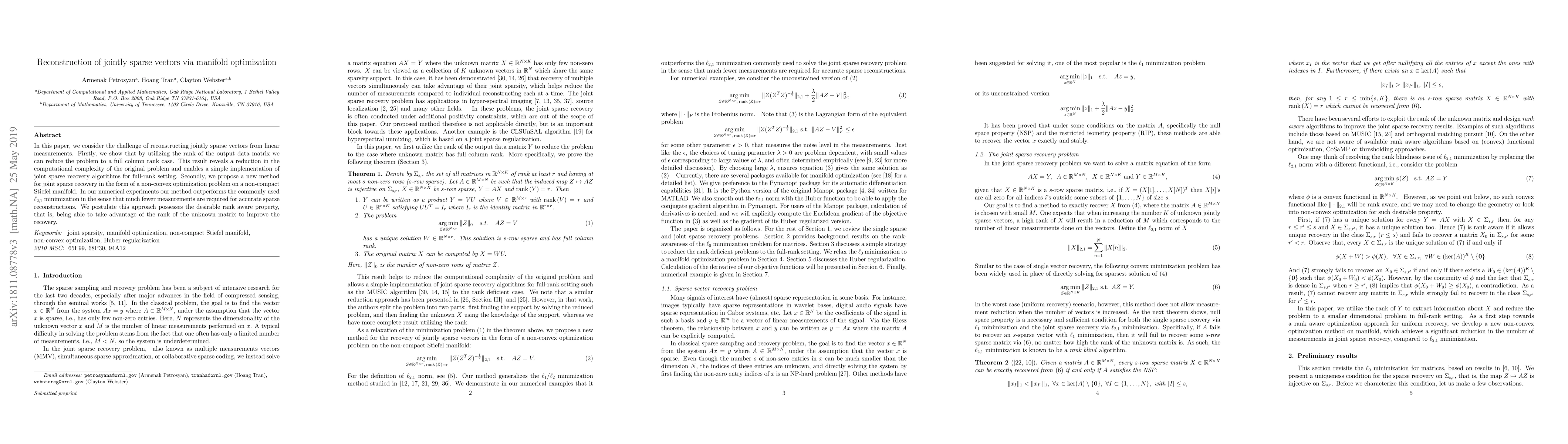 In this paper, we consider the challenge of reconstructing jointly sparse vectors from linear measurements. Firstly, we show that by utilizing the rank of the output data matrix we can reduce the problem to a full column rank case. This result reveals a reduction in the computational complexity of the original problem and enables a simple implementation of joint sparse recovery algorithms for full-rank setting. Secondly, we propose a new method for joint sparse recovery in the form of a non-convex optimization problem on a non-compact Stiefel manifold. In our numerical experiments our method outperforms the commonly used $\ell_{2,1}$ minimization in the sense that much fewer measurements are required for accurate sparse reconstructions. We postulate this approach possesses the desirable rank aware property, that is, being able to take advantage of the rank of the unknown matrix to improve the recovery.
