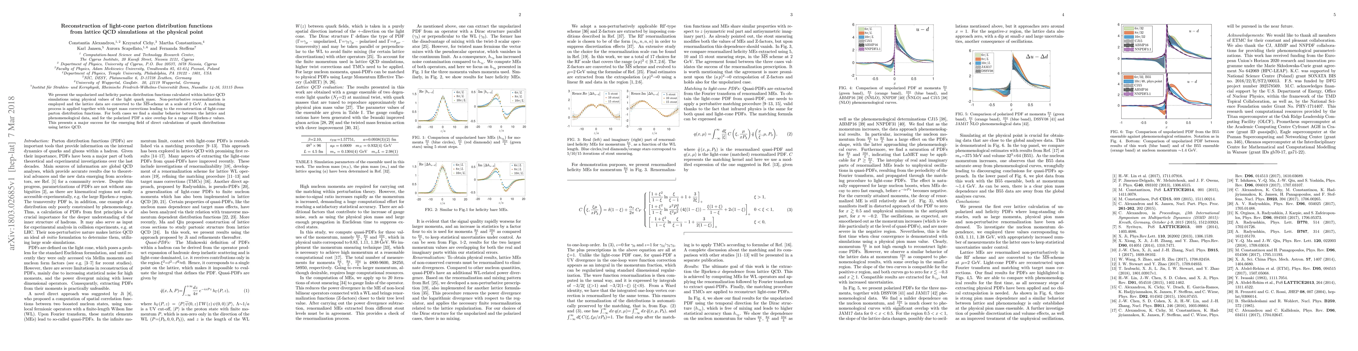 This paper reconstructs unpolarized and helicity parton distribution functions from lattice QCD using physical quark masses and non-perturbative renormalization, showing a good agreement with phenomenological data, marking a significant advancement in lattice QCD calculations.