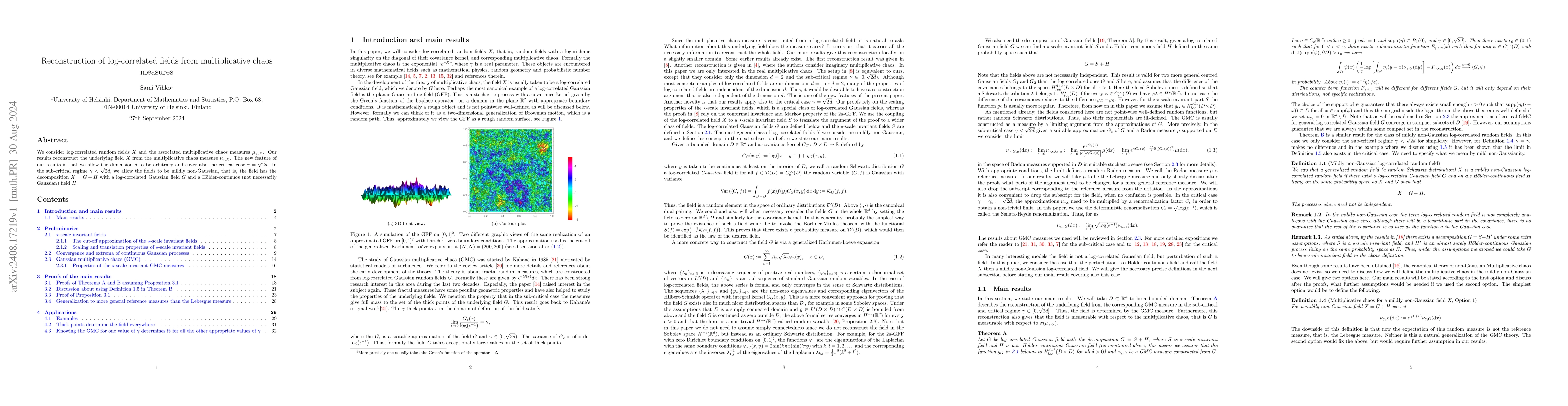This paper reconstructs log-correlated random fields $X$ from multiplicative chaos measures $\nu_{\gamma,X}$, allowing for arbitrary dimensions and covering the critical case $\gamma=\sqrt{2d}$. It also considers mildly non-Gaussian fields decomposed into a log-correlated Gaussian part and a H\"older-continuous part in the sub-critical regime.