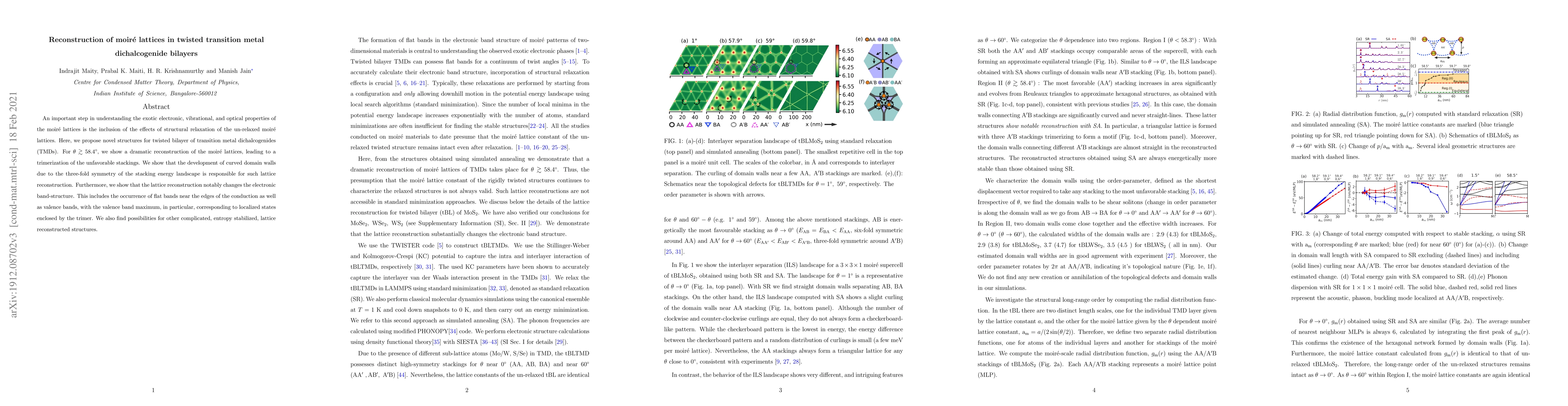 The paper presents a multi-scale simulation approach combining classical force-field-based methods and DFT calculations to study the structural relaxation and lattice reconstruction in twisted TMD bilayers.