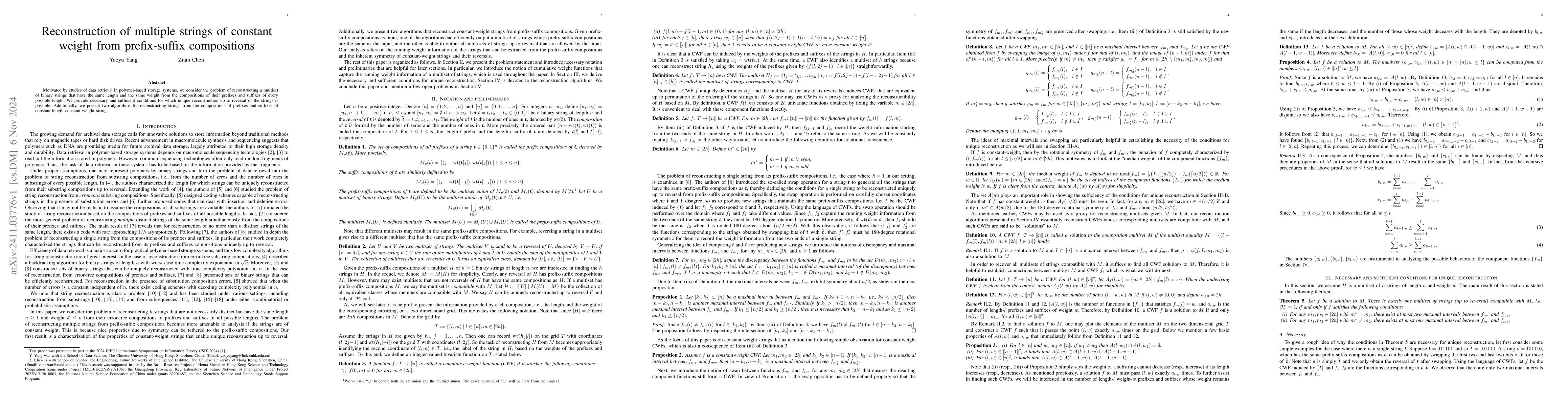 This paper addresses the challenge of reconstructing binary strings of equal length and weight in polymer-based storage systems from their prefix-suffix compositions. It establishes conditions for unique reconstruction and proposes two algorithms to achieve this reconstruction.