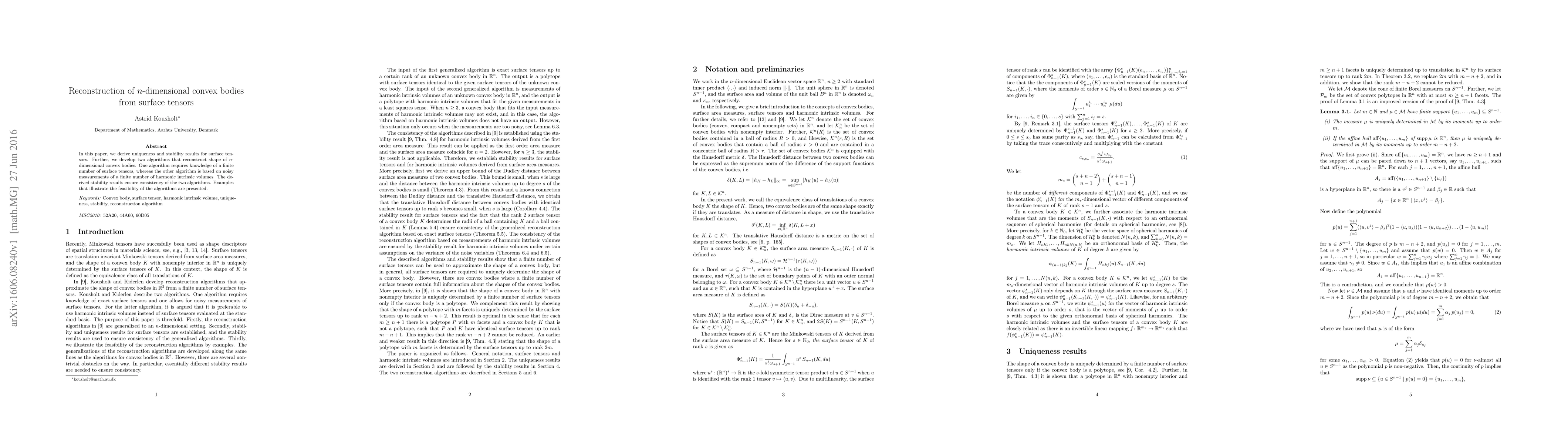 This research derives unique and stable surface tensor results for n-dimensional convex body reconstruction. Two algorithms are presented: one using finite surface tensors, and another employing noisy harmonic intrinsic volume measurements. Examples demonstrate the algorithms' feasibility.