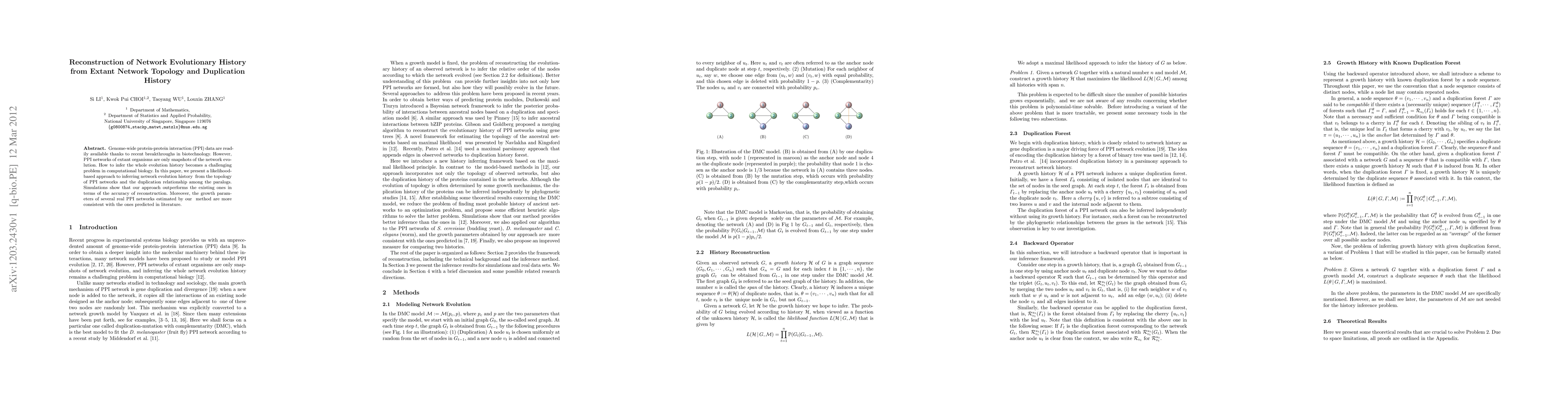 Genome-wide protein-protein interaction (PPI) data are readily available thanks to recent breakthroughs in biotechnology. However, PPI networks of extant organisms are only snapshots of the network evolution. How to infer the whole evolution history becomes a challenging problem in computational biology. In this paper, we present a likelihood-based approach to inferring network evolution history from the topology of PPI networks and the duplication relationship among the paralogs. Simulations show that our approach outperforms the existing ones in terms of the accuracy of reconstruction. Moreover, the growth parameters of several real PPI networks estimated by our method are more consistent with the ones predicted in literature.