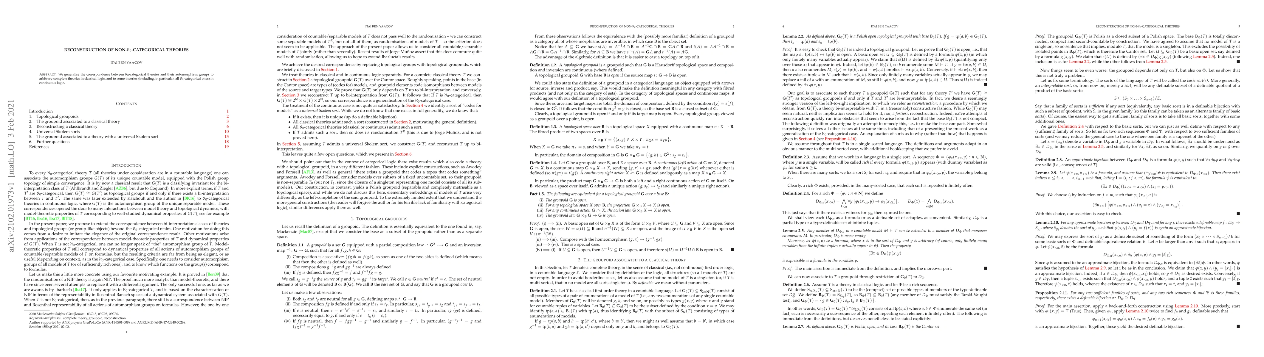 This paper extends the relationship between $\aleph_0$-categorical theories and their automorphism groups to all complete theories in classical logic and to certain complete theories in continuous logic. It provides a framework for reconstructing non-$\aleph_0$-categorical theories through their respective automorphism groups.