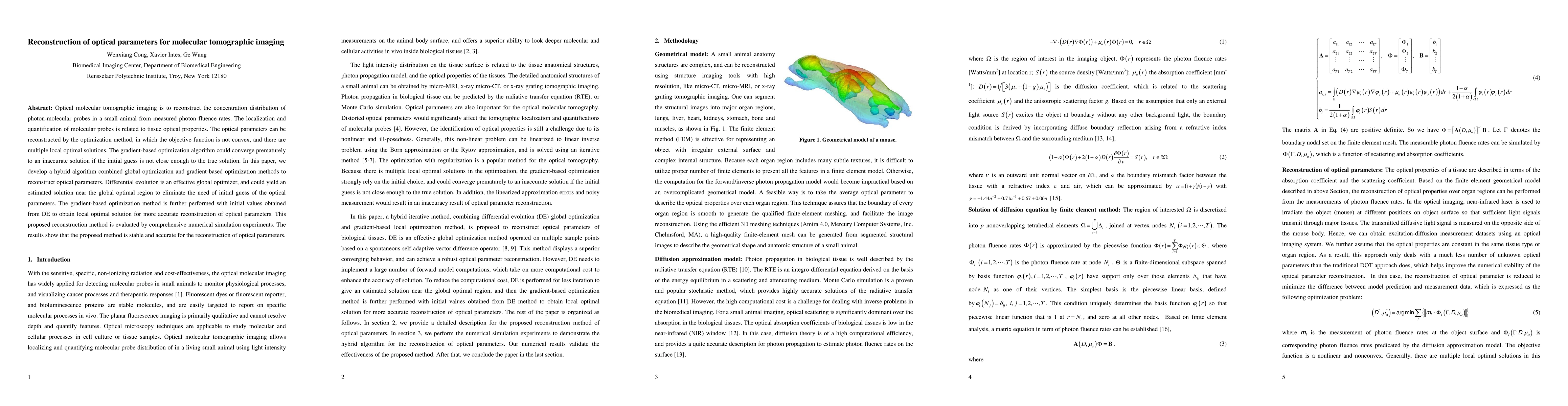 Researchers developed a hybrid algorithm to reconstruct optical parameters for molecular tomographic imaging, improving accuracy and stability through global optimization and gradient-based methods.