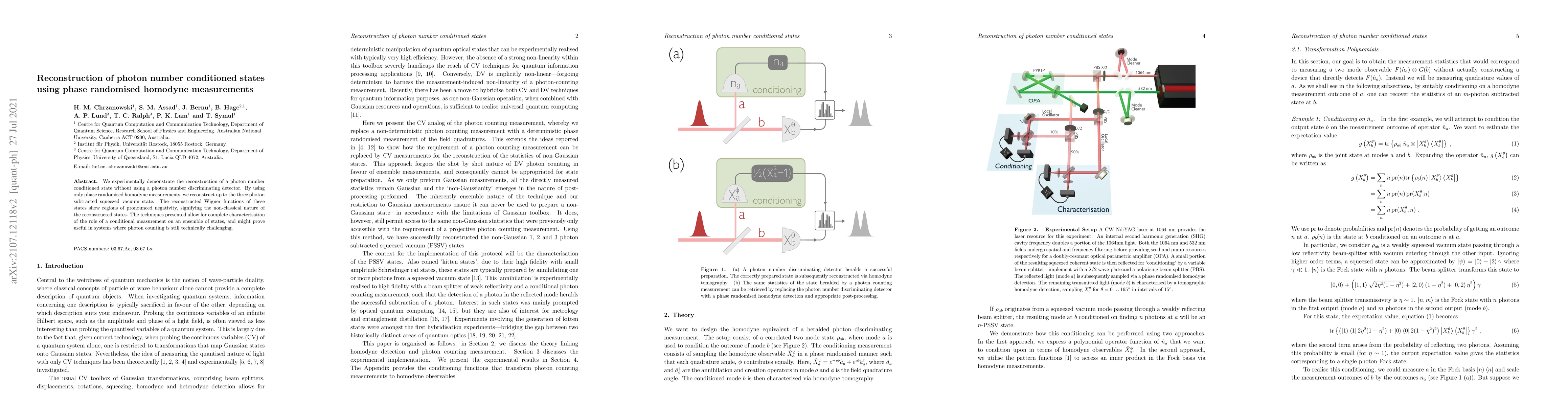 We experimentally demonstrate the reconstruction of a photon number conditioned state without using a photon number discriminating detector. By using only phase randomized homodyne measurements, we reconstruct up to the three photon subtracted squeezed vacuum state. The reconstructed Wigner functions of these states show regions of pronounced negativity, signifying the non-classical nature of the reconstructed states. The techniques presented allow for complete characterization of the role of a conditional measurement on an ensemble of states, and might prove useful in systems where photon counting still proves technically challenging.