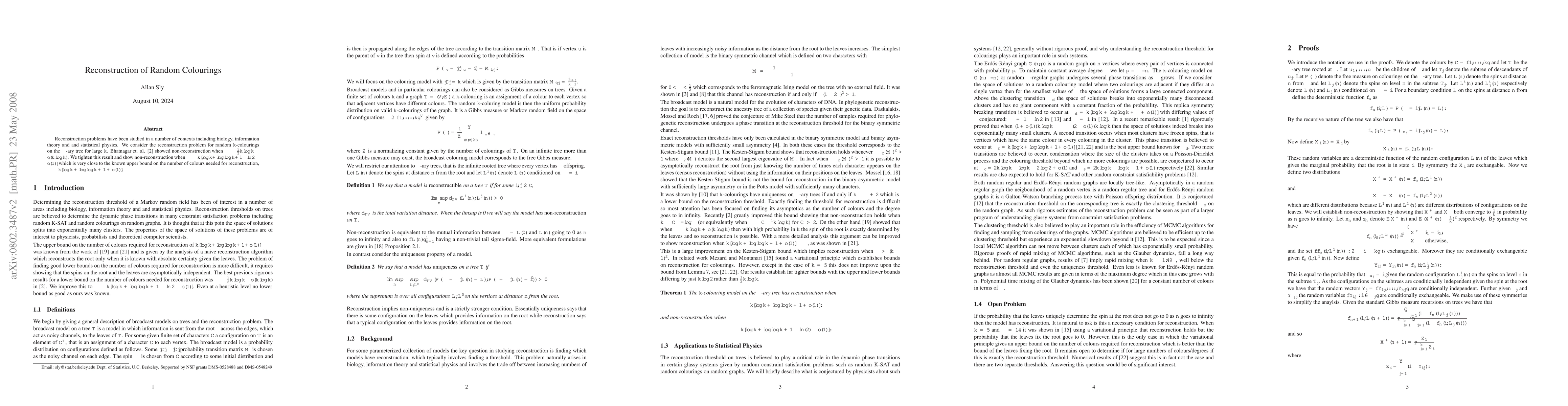 Reconstruction problems have been studied in a number of contexts including biology, information theory and and statistical physics. We consider the reconstruction problem for random $k$-colourings on the $\Delta$-ary tree for large $k$. Bhatnagar et. al. showed non-reconstruction when $\Delta \leq \frac12 k\log k - o(k\log k)$ and reconstruction when $\Delta \geq k\log k + o(k\log k)$. We tighten this result and show non-reconstruction when $\Delta \leq k[\log k + \log \log k + 1 - \ln 2 -o(1)]$ and reconstruction when $\Delta \geq k[\log k + \log \log k + 1+o(1)]$.