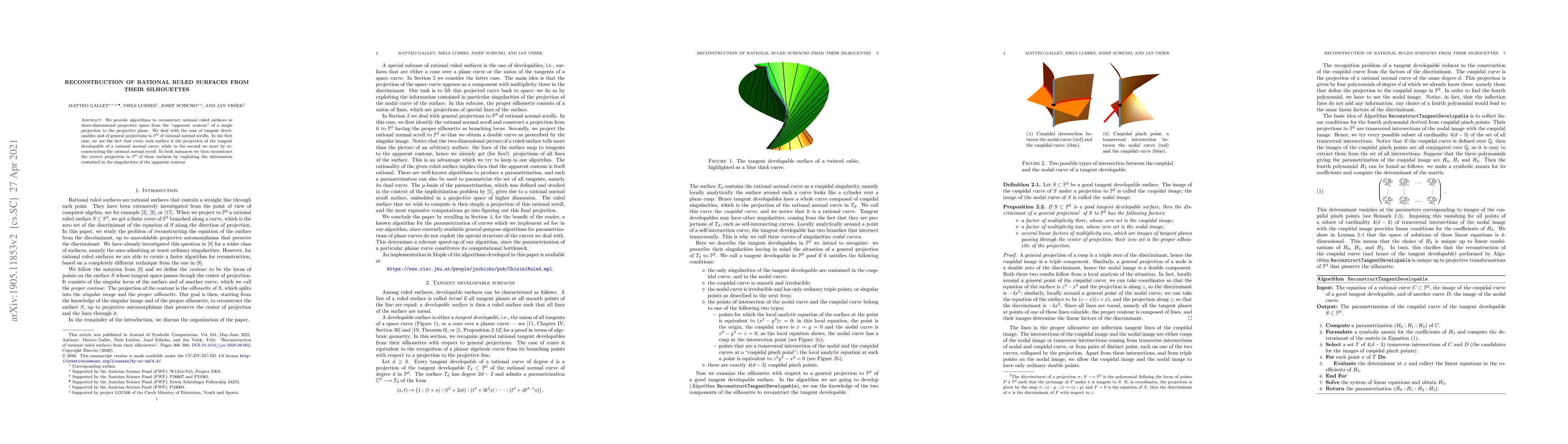 This paper presents algorithms to reconstruct rational ruled surfaces in 3D projective space from their silhouettes. It focuses on tangent developables and general projections of rational normal scrolls, leveraging the geometric properties of tangent developables and singularities in the apparent contour for reconstruction.