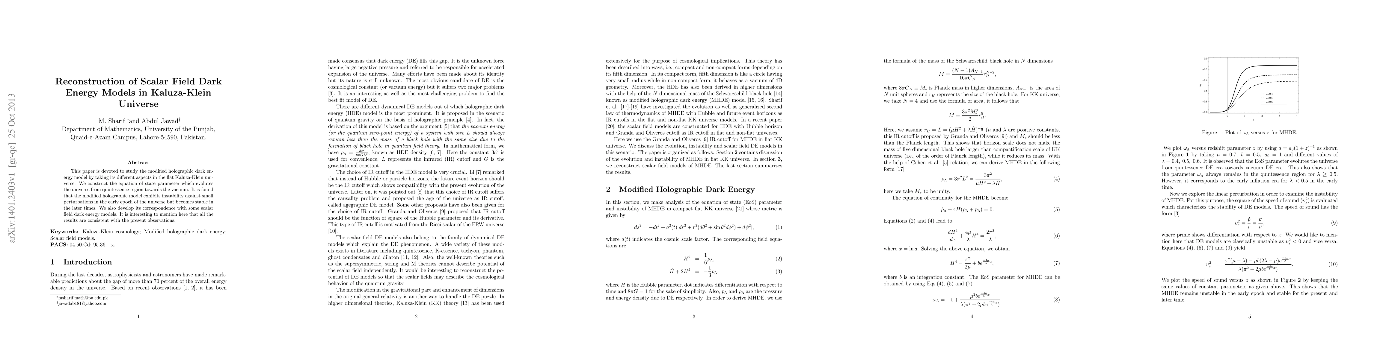 This paper explores the modified holographic dark energy model in a flat Kaluza-Klein universe, showing it transitions from quintessence to vacuum, and finds it unstable early on but stable later, consistent with observations. It also correlates this model with scalar field dark energy models.