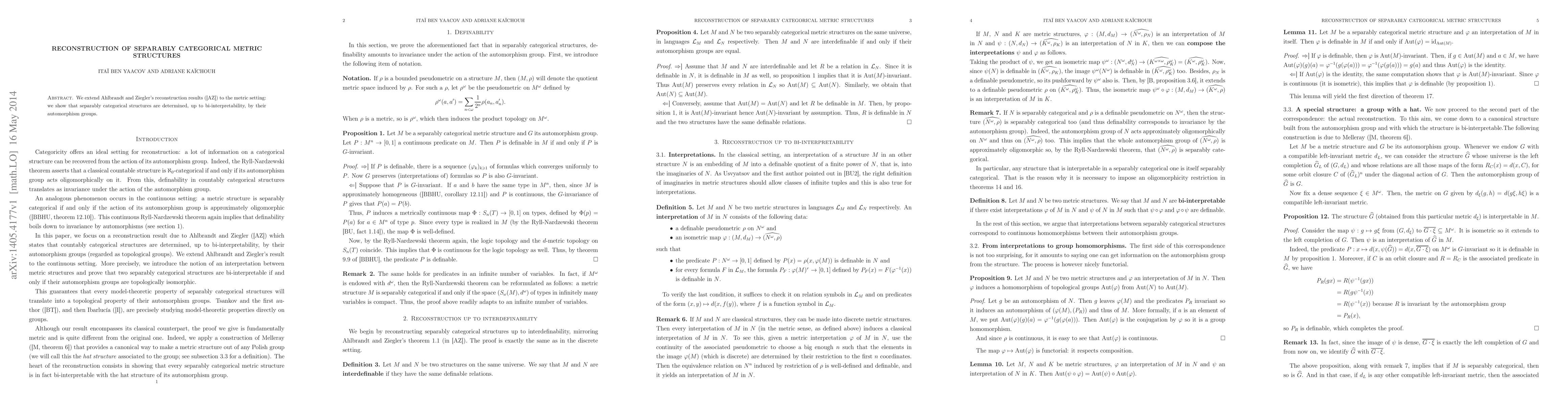 Summary: This paper extends reconstruction results to metric structures, demonstrating that separably categorical ones are bi-interpretable based solely on their automorphism groups. The focus is on the determination of these structures within the metric setting.