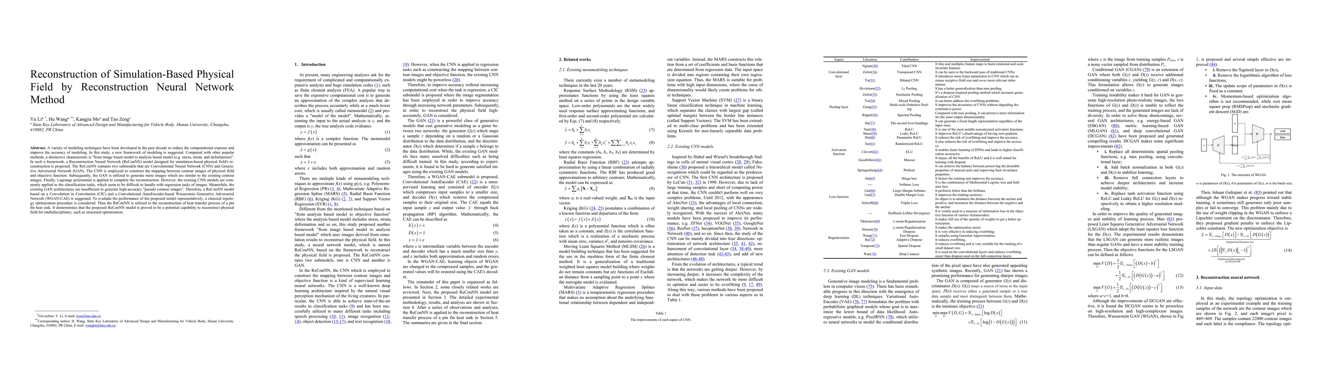 A variety of modeling techniques have been developed in the past decade to reduce the computational expense and improve the accuracy of modeling. In this study, a new framework of modeling is suggested. Compared with other popular methods, a distinctive characteristic is "from image based model to analysis based model (e.g. stress, strain, and deformation)". In such a framework, a reconstruction neural network (ReConNN) model designed for simulation-based physical field's reconstruction is proposed. The ReConNN contains two submodels that are convolutional neural network (CNN) and generative adversarial net-work (GAN). The CNN is employed to construct the mapping between contour images of physical field and objective function. Subsequently, the GAN is utilized to generate more images which are similar to the existing contour images. Finally, Lagrange polynomial is applied to complete the reconstruction. However, the existing CNN models are commonly applied to the classification tasks, which seem to be difficult to handle with regression tasks of images. Meanwhile, the existing GAN architectures are insufficient to generate high-accuracy "pseudo contour images". Therefore, a ReConNN model based on a Convolution in Convolution (CIC) and a Convolutional AutoEncoder based on Wasserstein Generative Adversarial Network (WGAN-CAE) is suggested. To evaluate the performance of the proposed model representatively, a classical topology optimization procedure is considered. Then the ReConNN is utilized to the reconstruction of heat transfer process of a pin fin heat sink. It demonstrates that the proposed ReConNN model is proved to be a potential capability to reconstruct physical field for multidisciplinary, such as structural optimization.
