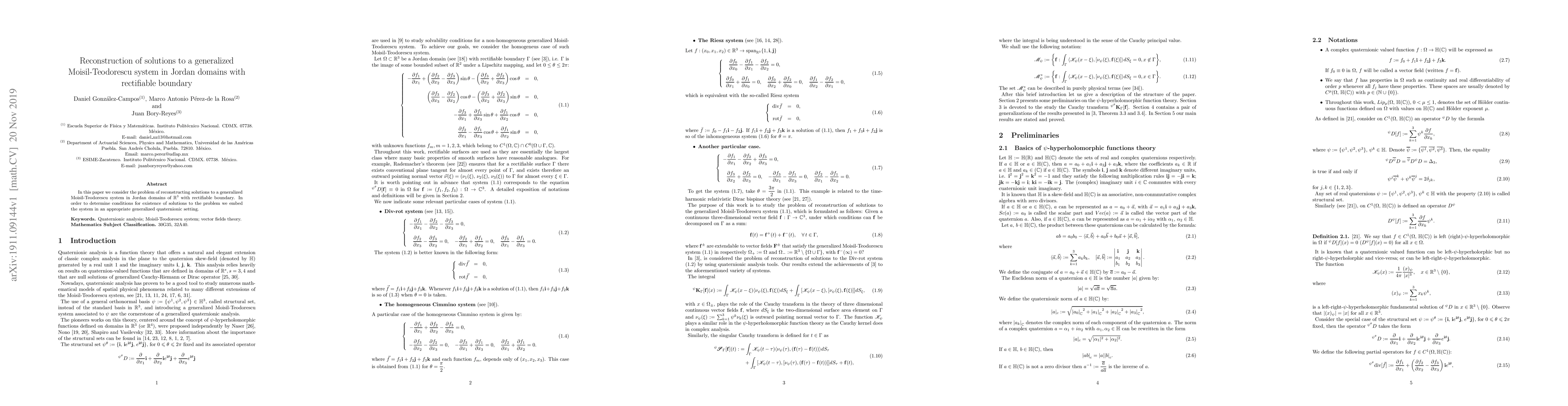 Researchers reconstructed solutions to a generalized Moisil-Teodorescu system in 3D Jordan domains with rectifiable boundaries using an embedding in generalized quaternionic setting.