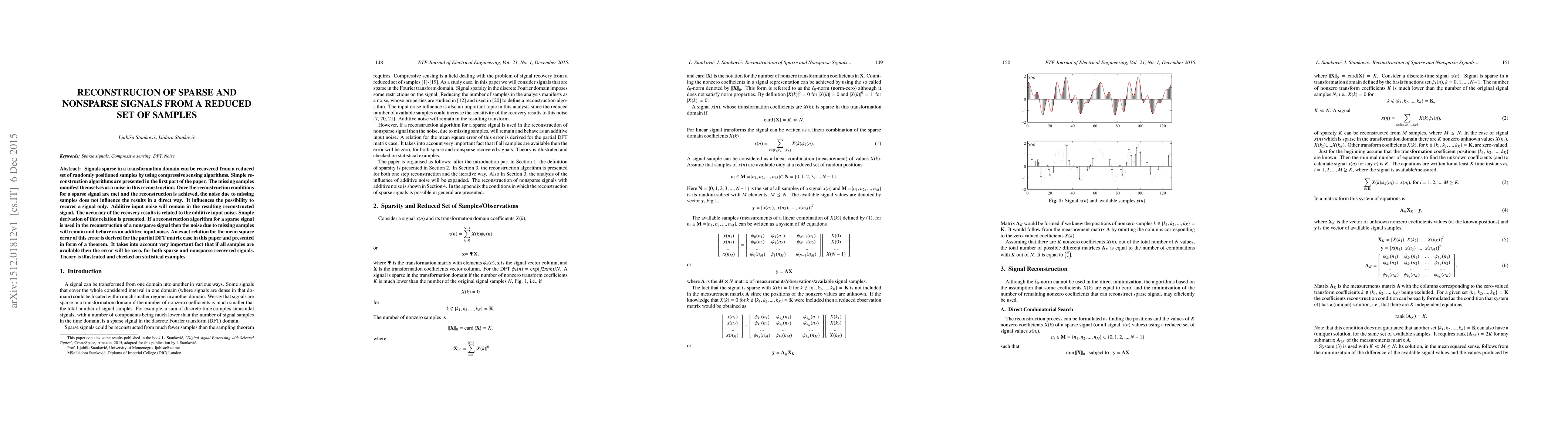 Signals sparse in a transformation domain can be recovered from a reduced set of randomly positioned samples by using compressive sensing algorithms. Simple re- construction algorithms are presented in the first part of the paper. The missing samples manifest themselves as a noise in this reconstruction. Once the reconstruction conditions for a sparse signal are met and the reconstruction is achieved, the noise due to missing samples does not influence the results in a direct way. It influences the possibility to recover a signal only. Additive input noise will remain in the resulting reconstructed signal. The accuracy of the recovery results is related to the additive input noise. Simple derivation of this relation is presented. If a reconstruction algorithm for a sparse signal is used in the reconstruction of a nonsparse signal then the noise due to missing samples will remain and behave as an additive input noise. An exact relation for the mean square error of this error is derived for the partial DFT matrix case in this paper and presented in form of a theorem. It takes into account very important fact that if all samples are available then the error will be zero, for both sparse and nonsparse recovered signals. Theory is illustrated and checked on statistical examples.