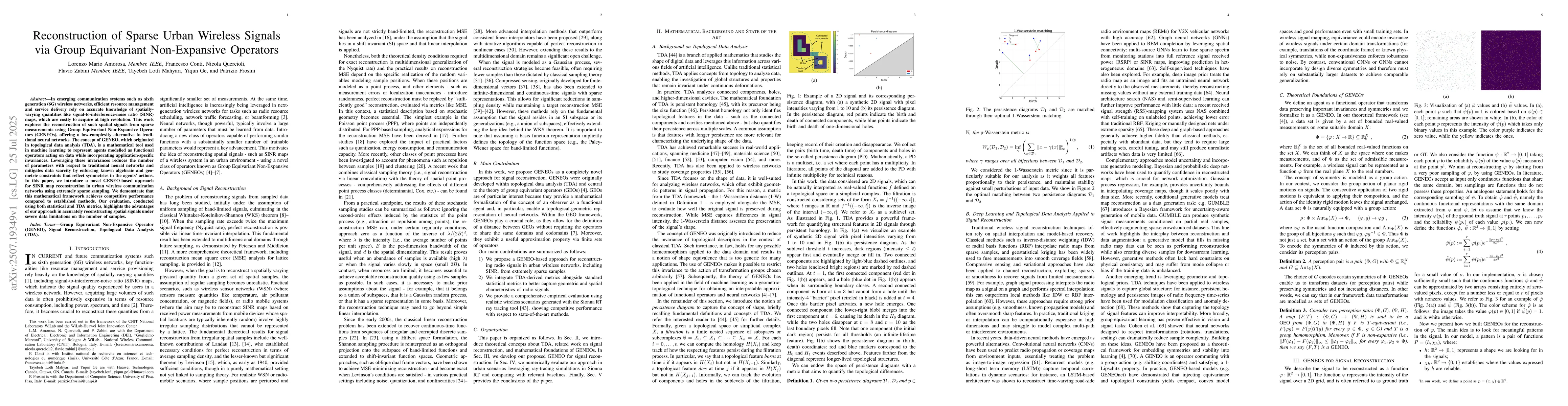 In emerging communication systems such as sixth generation (6G) wireless networks, efficient resource management and service delivery rely on accurate knowledge of spatially-varying quantities like signal-to-interference-noise ratio (SINR) maps, which are costly to acquire at high resolution. This work explores the reconstruction of such spatial signals from sparse measurements using Group Equivariant Non-Expansive Operators (GENEOs), offering a low-complexity alternative to traditional neural networks. The concept of GENEO, which originated in topological data analysis (TDA), is a mathematical tool used in machine learning to represent agents modelled as functional operators acting on data while incorporating application-specific invariances. Leveraging these invariances reduces the number of parameters with respect to traditional neural networks and mitigates data scarcity by enforcing known algebraic and geometric constraints that reflect symmetries in the agents' actions. In this paper, we introduce a novel GENEO-based approach for SINR map reconstruction in urban wireless communication networks using extremely sparse sampling. We demonstrate that this mathematical framework achieves competitive performance compared to established methods. Our evaluation, conducted using both statistical and TDA metrics, highlights the advantages of our approach in accurately reconstructing spatial signals under severe data limitations on the number of samples.