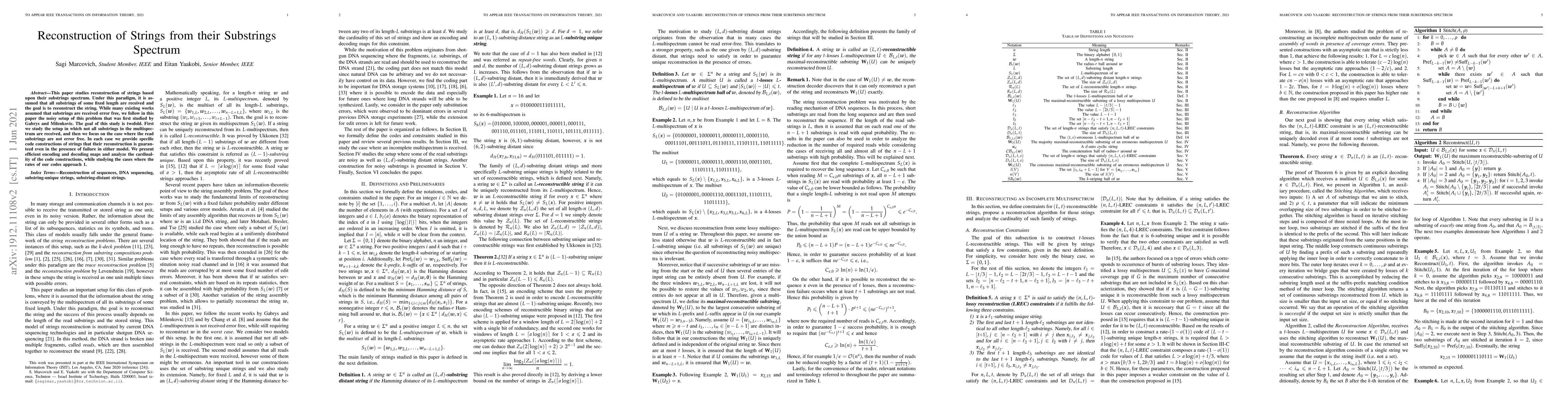 This paper explores the reconstruction of strings from their substrings spectrum under noisy conditions, providing efficient encoding and decoding methods to ensure reconstruction even when not all substrings are received or are error-free. It analyzes the cardinality of the code constructions and examines scenarios where code rates approach 1.