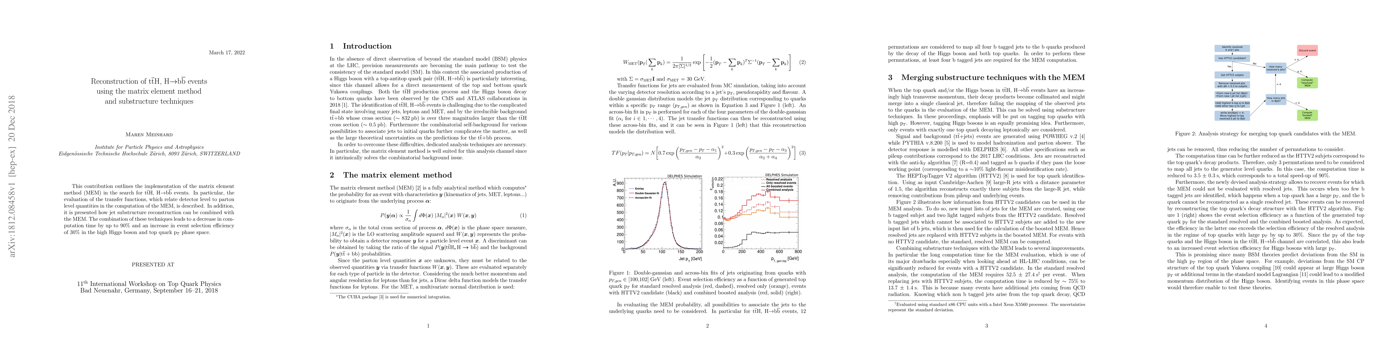 This paper details the application of the matrix element method (MEM) and jet substructure techniques to reconstruct $\text{t}\bar{\text{t}}$H events, where H decays to $\text{b}\bar{\text{b}}$. The integration of these methods reduces computation time by 90% and boosts event selection efficiency by 30%.