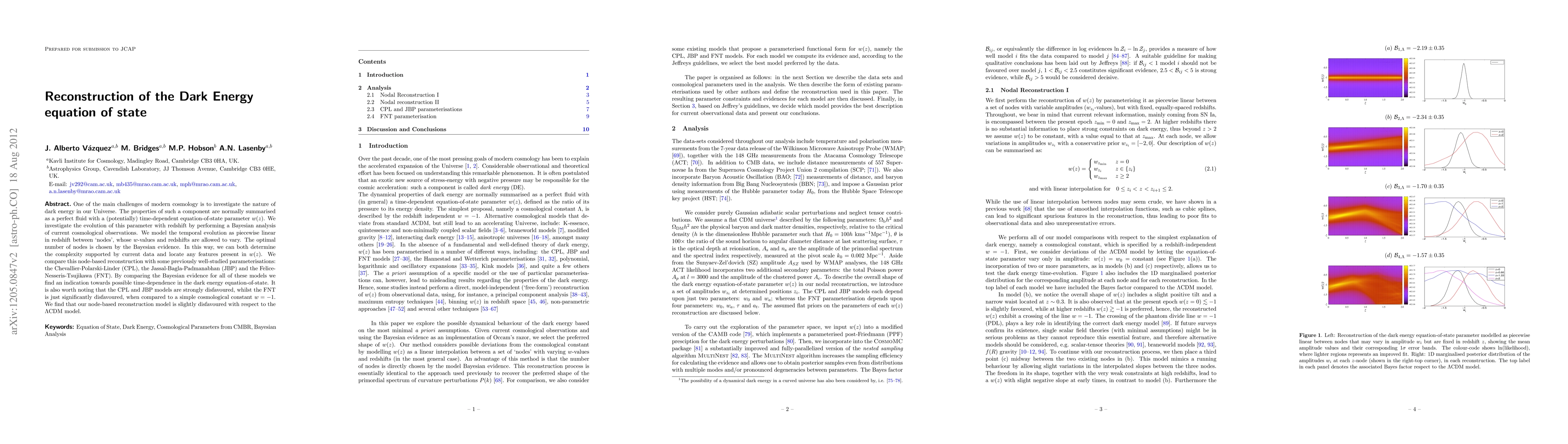 The research uses a Bayesian analysis to reconstruct the dark energy equation of state parameter, w(z), with an optimal nodal reconstruction where w(z) is interpolated linearly between nodes with varying wzi-values and redshifts. The number and location of nodes are chosen directly by the Bayesian evidence.