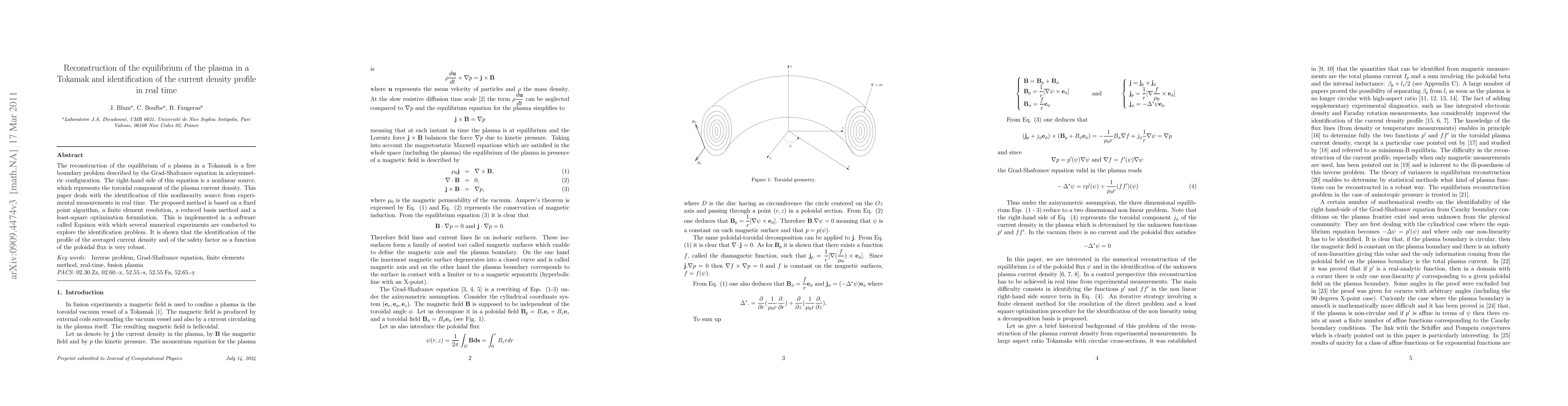 The reconstruction of the equilibrium of a plasma in a Tokamak is a free boundary problem described by the Grad-Shafranov equation in axisymmetric configuration. The right-hand side of this equation is a nonlinear source, which represents the toroidal component of the plasma current density. This paper deals with the identification of this nonlinearity source from experimental measurements in real time. The proposed method is based on a fixed point algorithm, a finite element resolution, a reduced basis method and a least-square optimization formulation. This is implemented in a software called Equinox with which several numerical experiments are conducted to explore the identification problem. It is shown that the identification of the profile of the averaged current density and of the safety factor as a function of the poloidal flux is very robust.