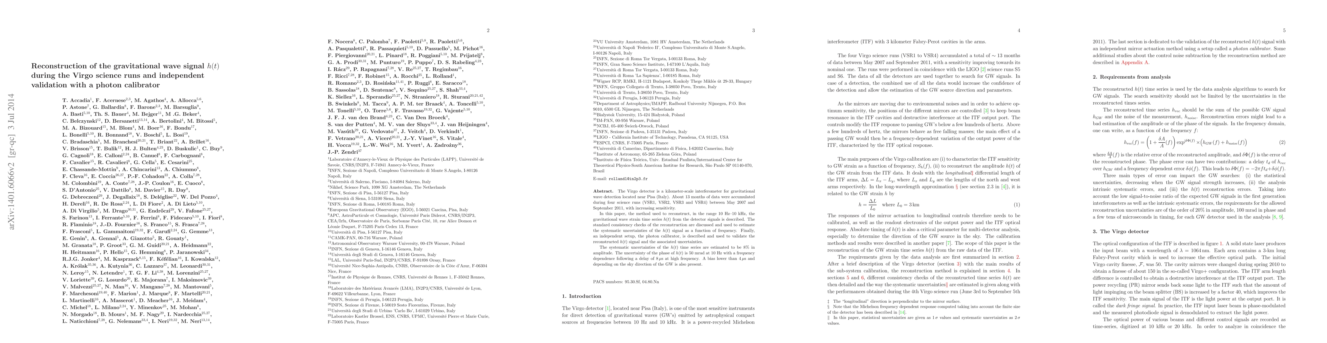 The Virgo detector is a kilometer-scale interferometer for gravitational wave detection located near Pisa (Italy). About 13 months of data were accumulated during four science runs (VSR1, VSR2, VSR3 and VSR4) between May 2007 and September 2011, with increasing sensitivity. In this paper, the method used to reconstruct, in the range 10 Hz-10 kHz, the gravitational wave strain time series $h(t)$ from the detector signals is described. The standard consistency checks of the reconstruction are discussed and used to estimate the systematic uncertainties of the $h(t)$ signal as a function of frequency. Finally, an independent setup, the photon calibrator, is described and used to validate the reconstructed $h(t)$ signal and the associated uncertainties. The uncertainties of the $h(t)$ time series are estimated to be 8% in amplitude. The uncertainty of the phase of $h(t)$ is 50 mrad at 10 Hz with a frequency dependence following a delay of 8 $\mu$s at high frequency. A bias lower than $4\,\mathrm{\mu s}$ and depending on the sky direction of the GW is also present.