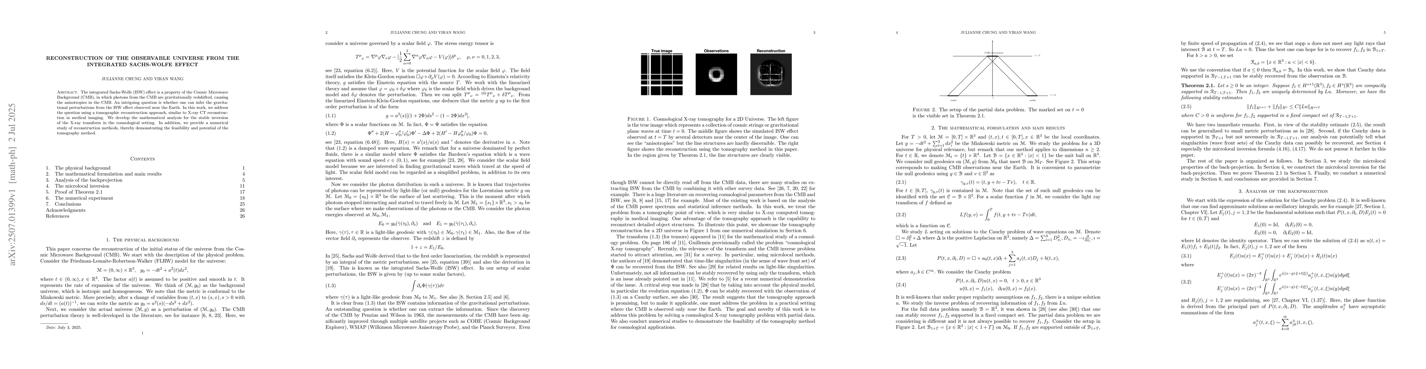 The integrated Sachs-Wolfe (ISW) effect is a property of the Cosmic Microwave Background (CMB), in which photons from the CMB are gravitationally redshifted, causing the anisotropies in the CMB. An intriguing question is whether one can infer the gravitational perturbations from the ISW effect observed near the Earth. In this work, we address the question using a tomographic reconstruction approach, similar to X-ray CT reconstruction in medical imaging. We develop the mathematical analysis for the stable inversion of the X-ray transform in the cosmological setting. In addition, we provide a numerical study of reconstruction methods, thereby demonstrating the feasibility and potential of the tomography method.