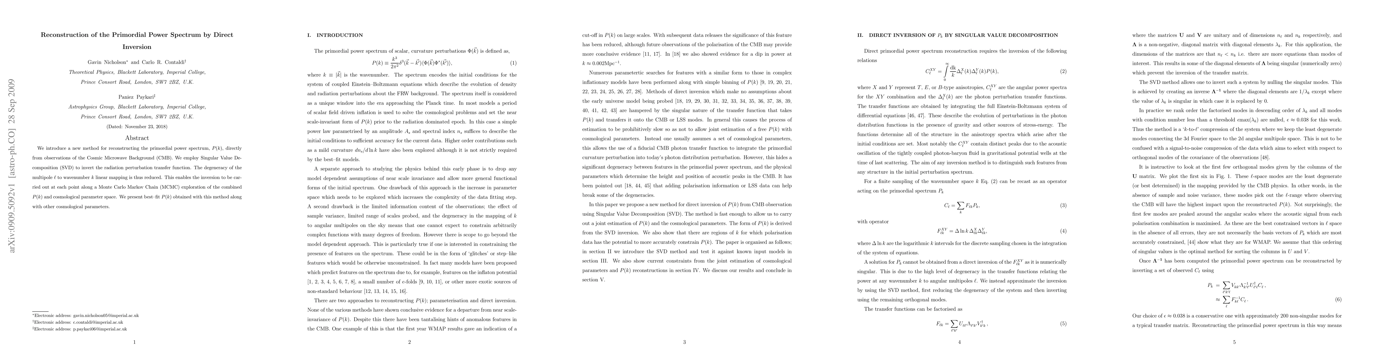 We introduce a new method for reconstructing the primordial power spectrum, $P(k)$, directly from observations of the Cosmic Microwave Background (CMB). We employ Singular Value Decomposition (SVD) to invert the radiation perturbation transfer function. The degeneracy of the multipole $\ell$ to wavenumber $k$ linear mapping is thus reduced. This enables the inversion to be carried out at each point along a Monte Carlo Markov Chain (MCMC) exploration of the combined $P(k)$ and cosmological parameter space. We present best--fit $P(k)$ obtained with this method along with other cosmological parameters.