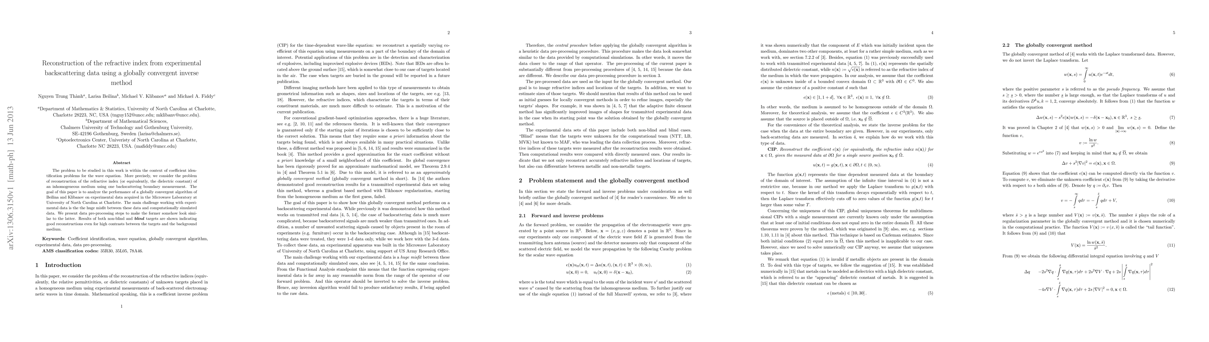 This paper investigates the reconstruction of the refractive index using a globally convergent inverse method on experimental backscattering data. The authors analyze the performance of Beilina and Klibanov's algorithm on data from the Microwave Laboratory, addressing the challenge of data misfit through pre-processing and demonstrating successful reconstructions for both non-blind and blind targets.